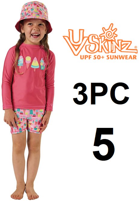 3PC GIRL'S UV Skinz upf 50+ protection swim suit and hat set - 5 - PINK / ICE CREAM (style: 8072777)