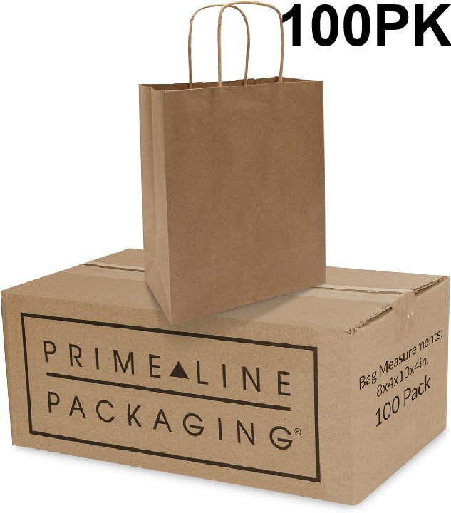 100pk Prime Line Packaging Paper Bags - 8" x 4" x 10" - brown - (MODEL: BROWN_KRAFT)