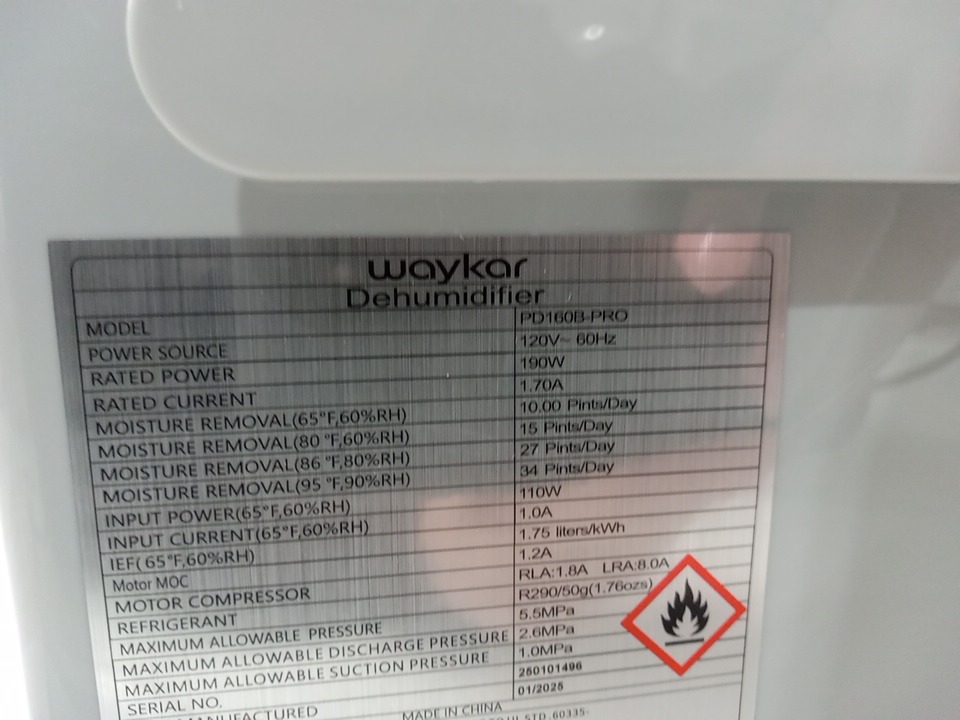 Waykar Dehumidifier with Auto or Manual Drainage - 0.6gal Water Tank Capacity - covers 2000 sq.ft - white (model: pd160b-pro)