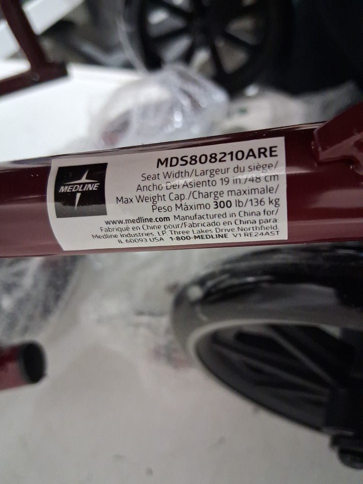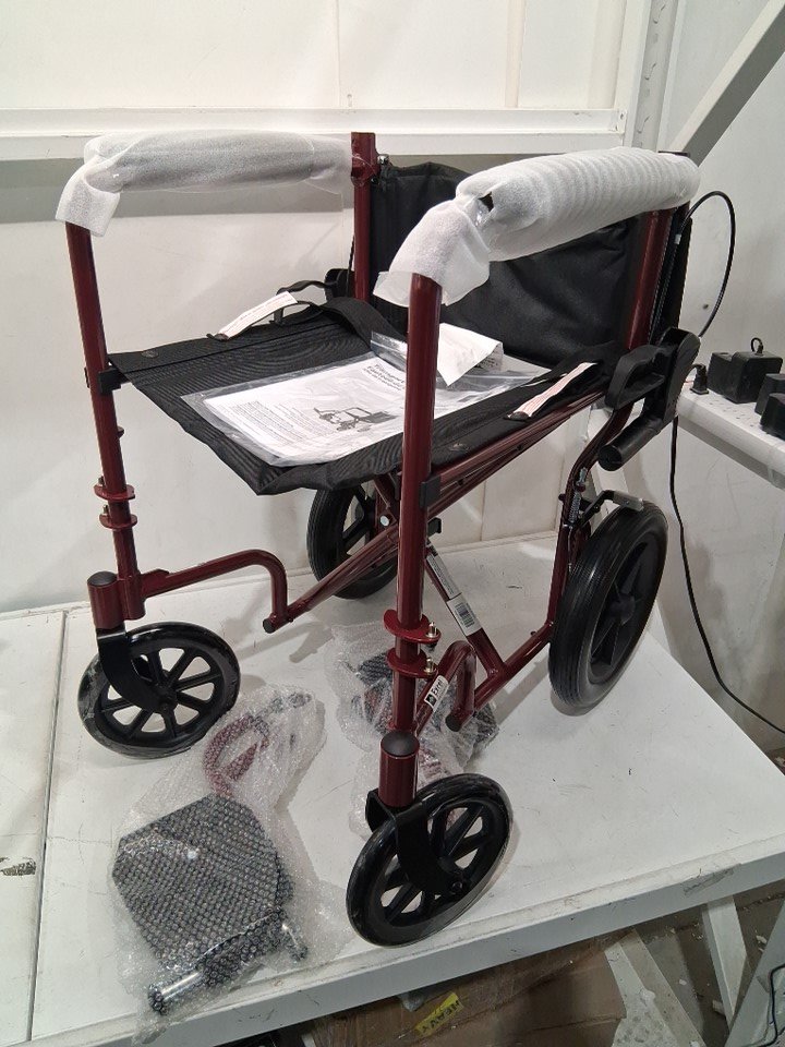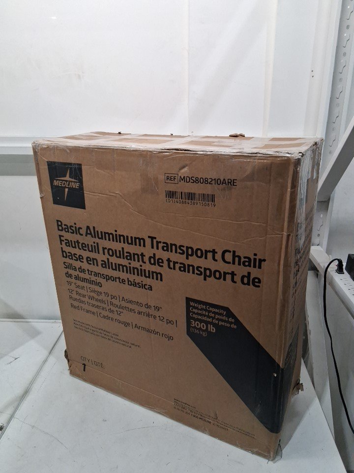 MEDLINE BASIC ALUMINUM TRANSPORT WHEELCHAIR - 19" - 12" REAR WHEELS WITH BRAKES - 300lbs capacity - RED (MODEL: MDS808210ARE)