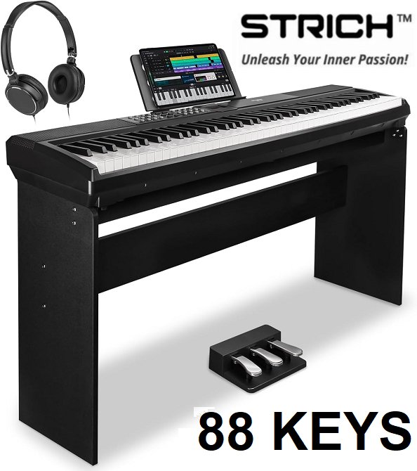 strich full size electric weighted keyboard piano with 88 keys, sustain pedal & stand - keyboard supports usb-midi/wireless connect, 15W x2 built-in speakers and headphones - black (model: sdp-120)