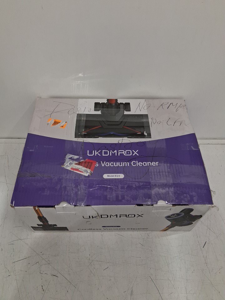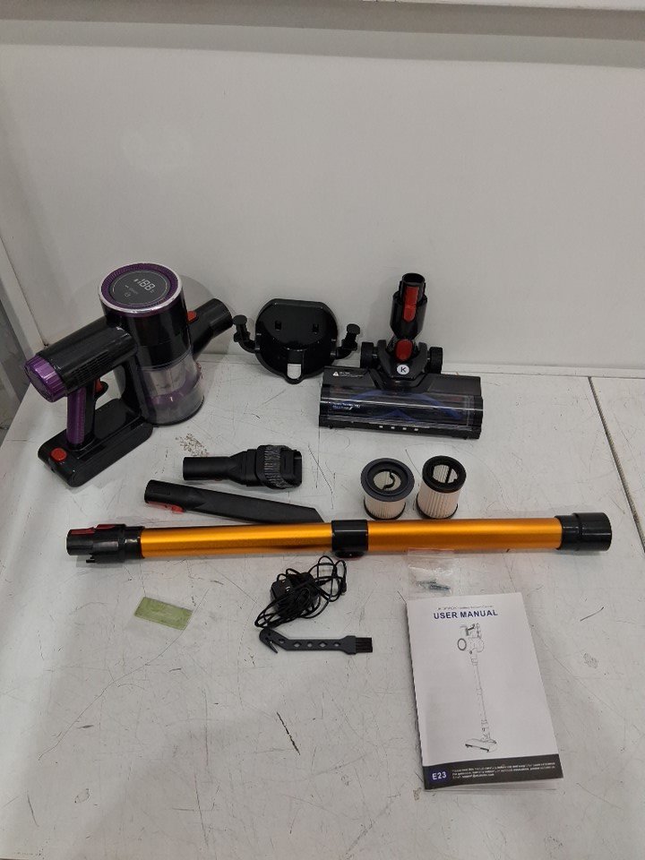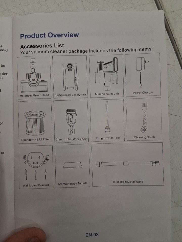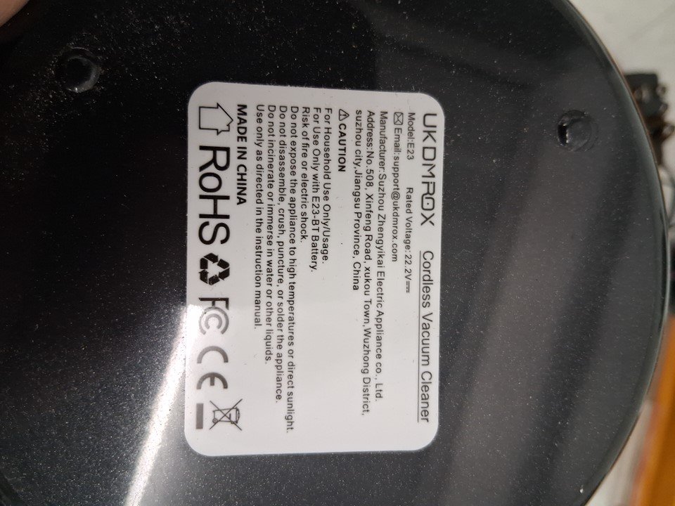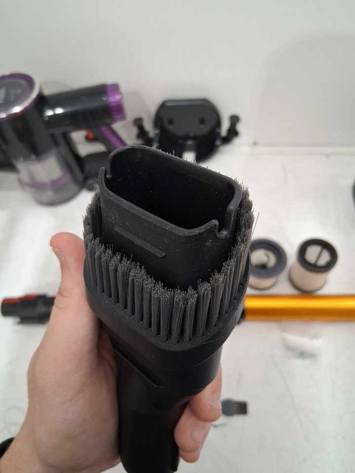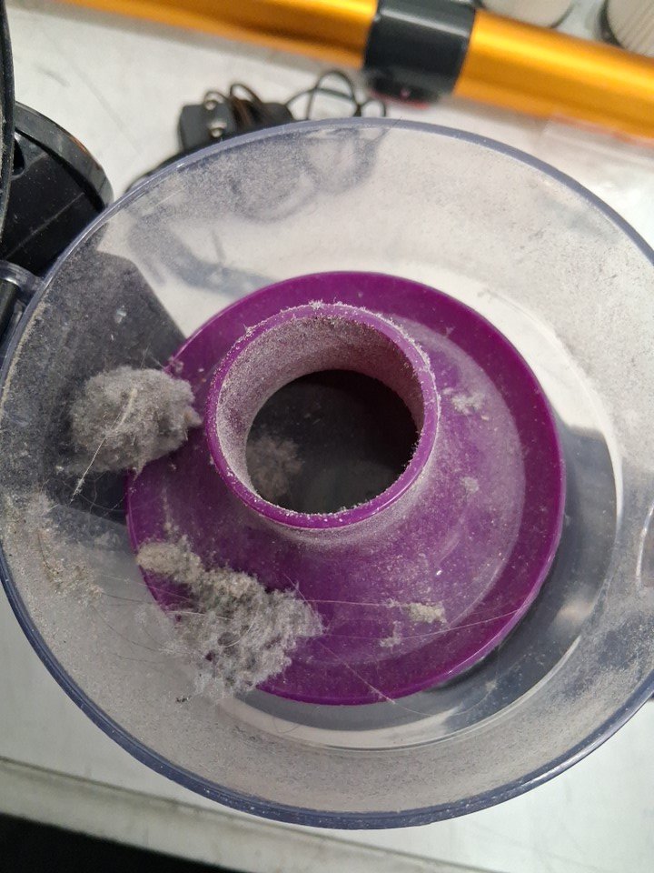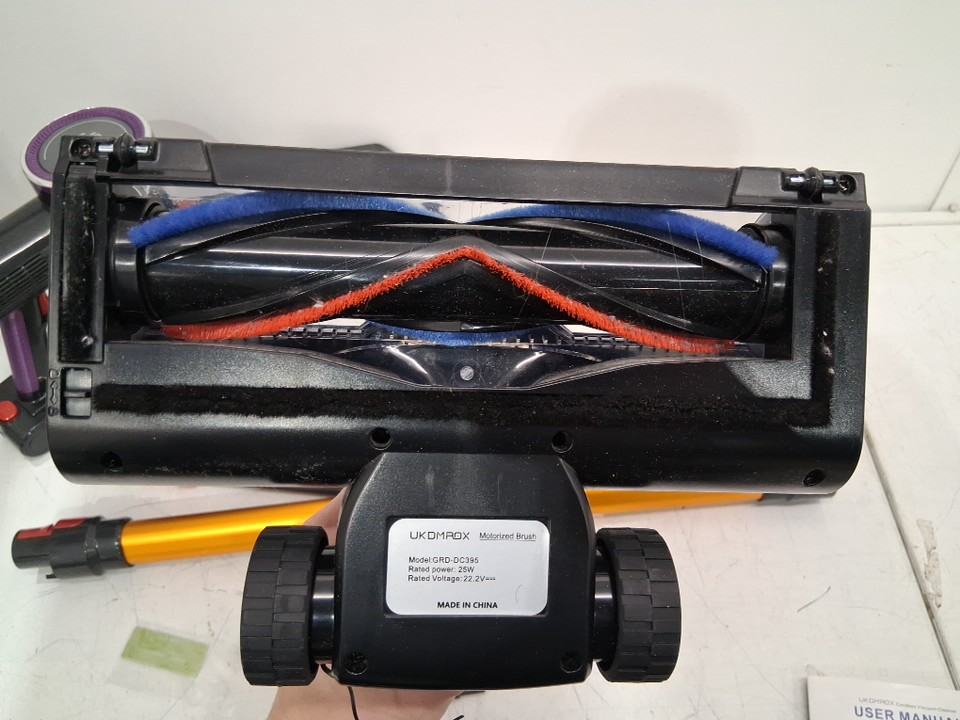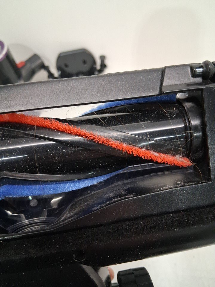 There was some hair on the roller brush part of the vacuum, and the tank has dust bunnies in it due to previous use. The vacuum and the charging block were tested for basic power.