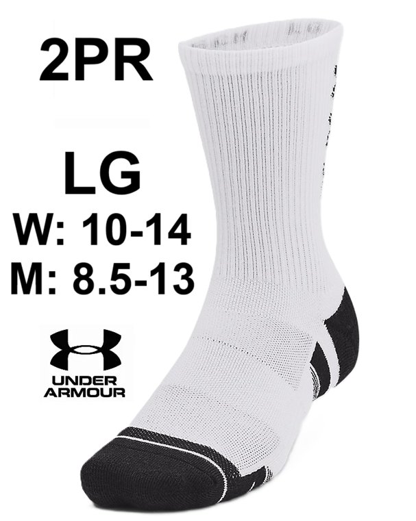 2PR UNISEX UNDER ARMOUR UA PERFORMANCE TECH MID-CREW SOCKS - LARGE (SIZE 10-14 WOMEN, SIZE 8.5-13 MEN) - WHITE/BLACK