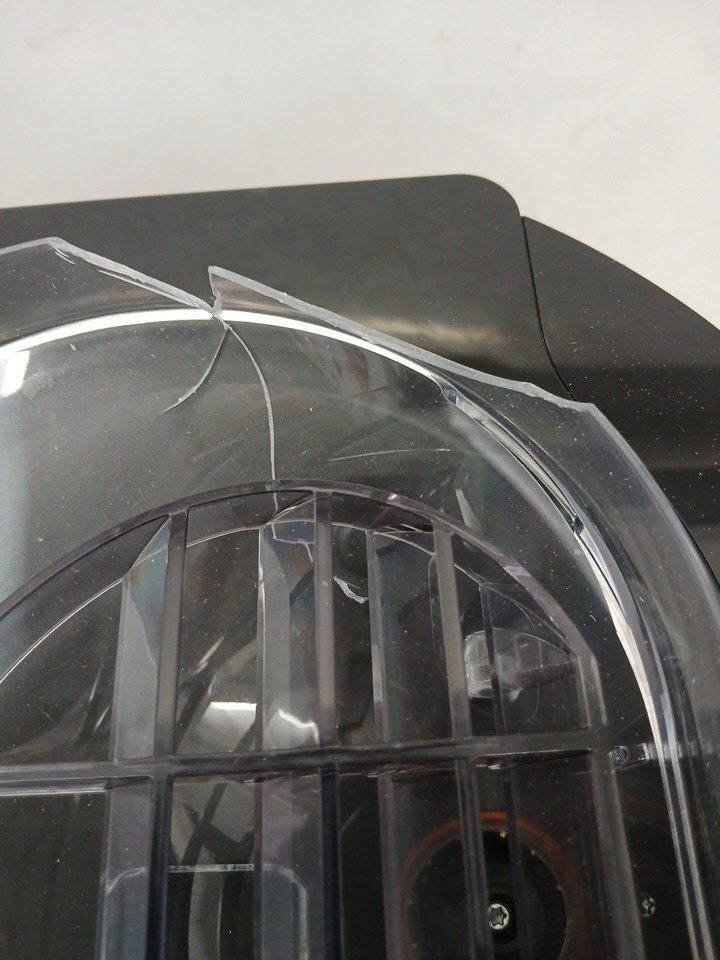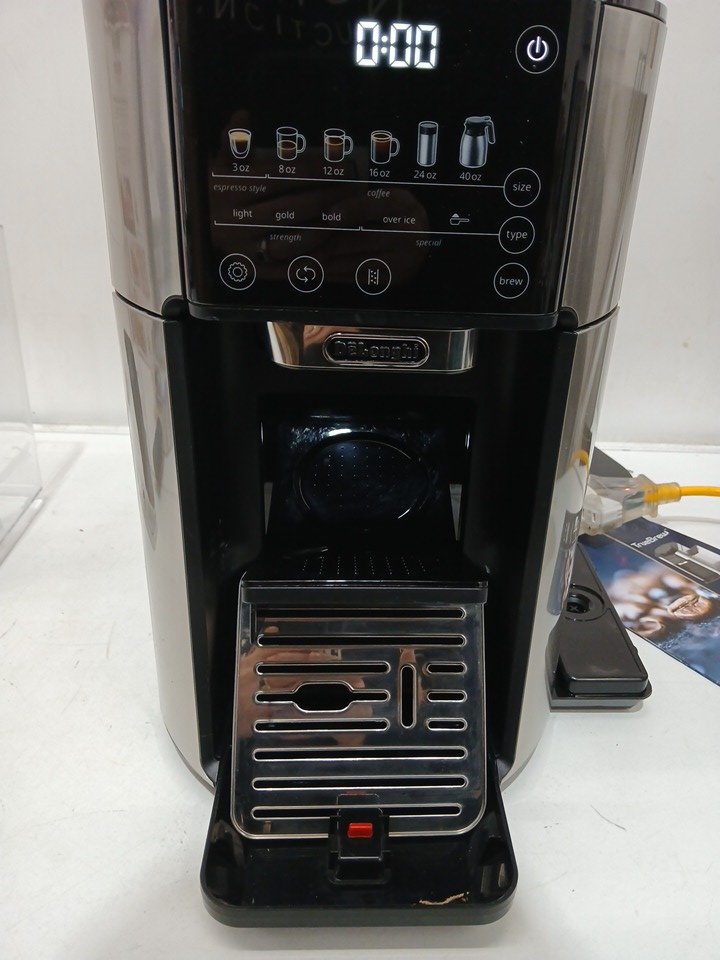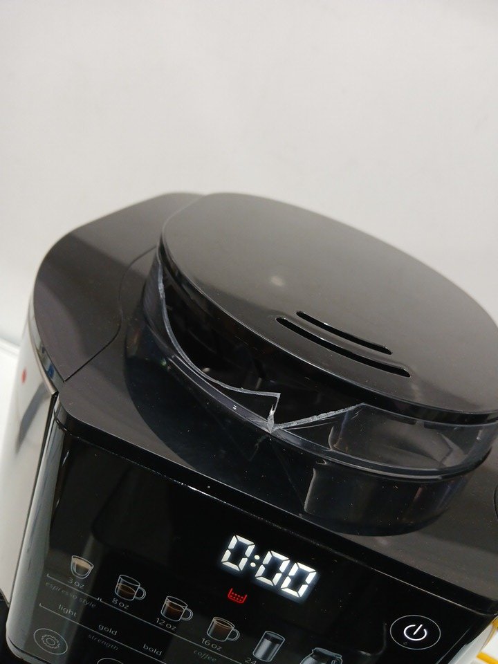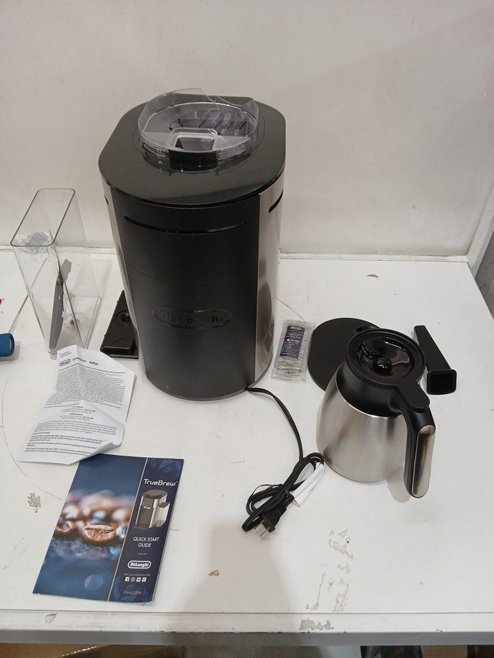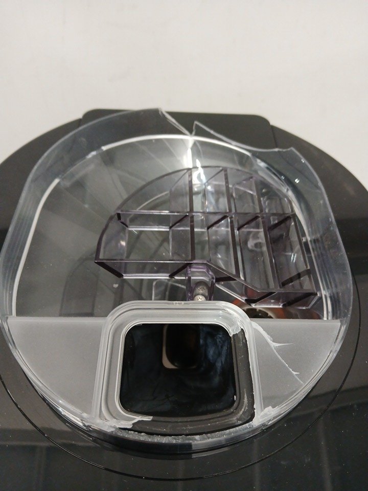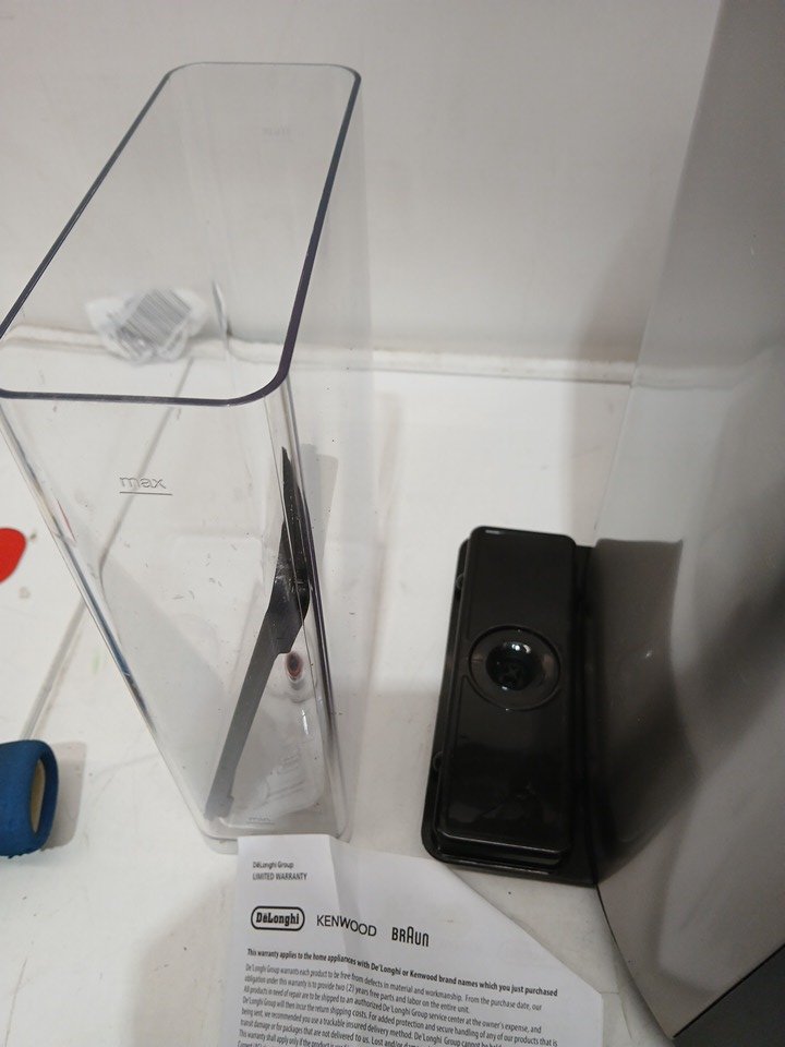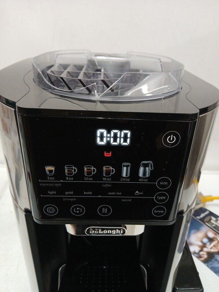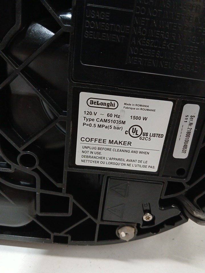 Please note the bean hopper is damaged, and will need to be replaced. The slot for the water reservoir is damaged, we are unsure if this will affect function. There is a presence of scuffs/scratches/coffee grinds. This unit has been tested for power only. Most parts for Delonghi espresso machines can be purchased officially off their website for repairs; https://www.delonghispareparts.com/products/cam51035m