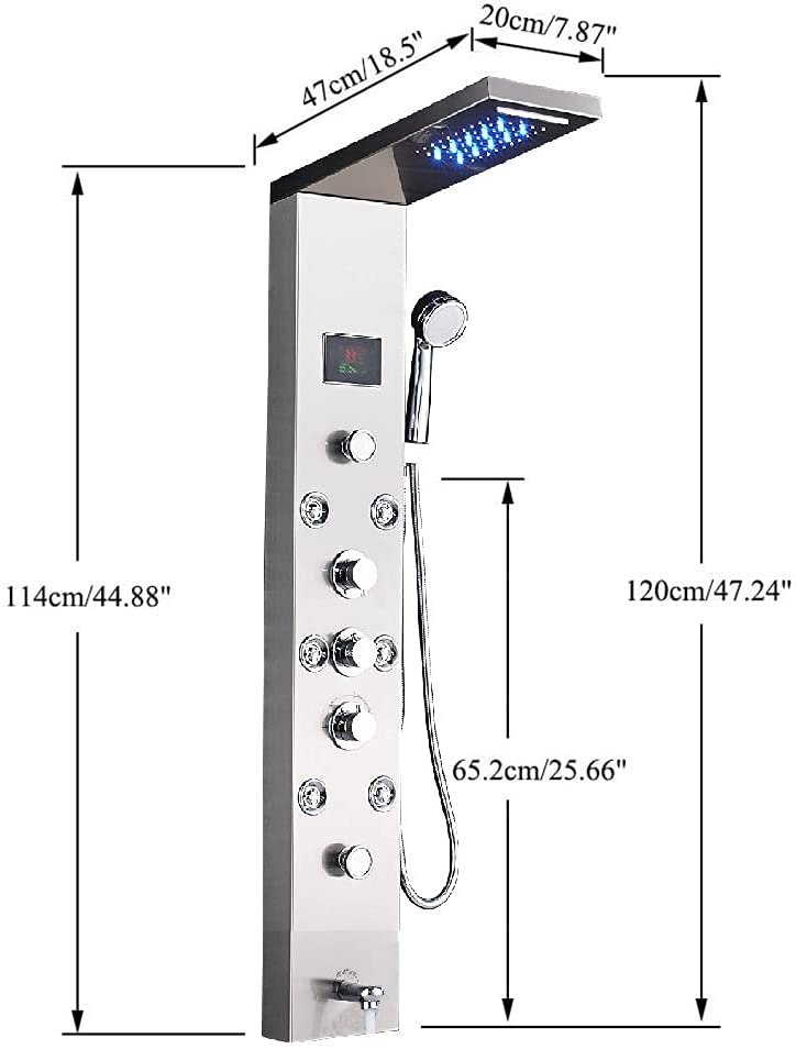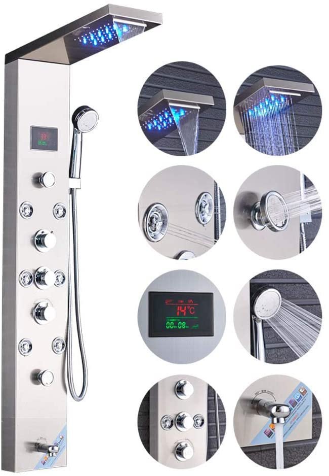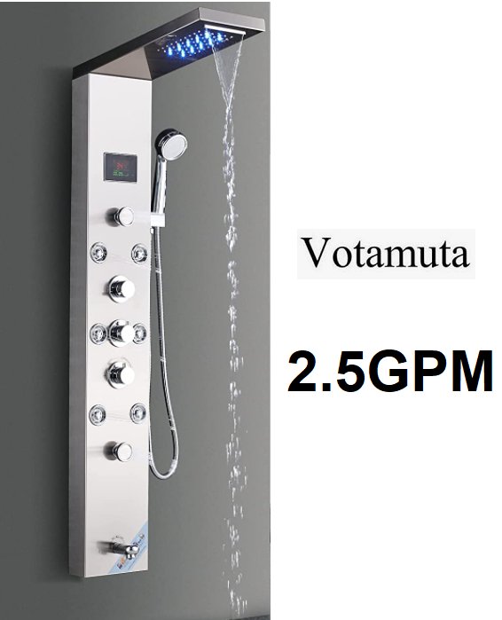 VOTAMUTA WALL MOUNTED SHOWER TOWER SYSTEM W/ BATH MASSAGE JETS, HANDHELD SPRAYER & LED SCREEN, 2.5GPM (SILVER) (MODEL: ‎VO2018011341)