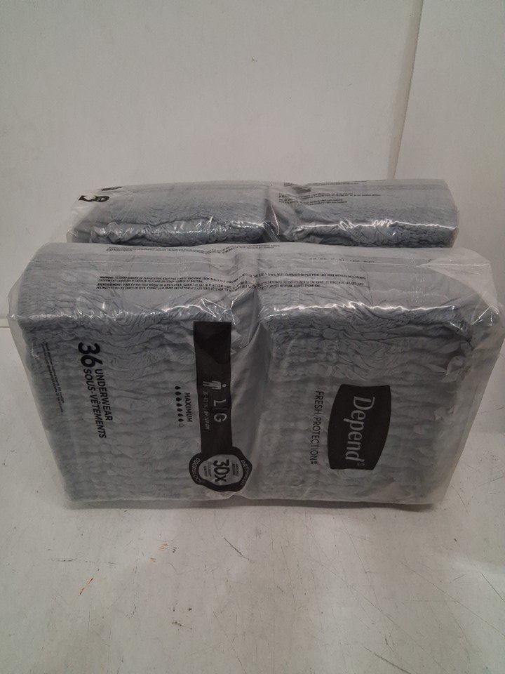 72PK MENS DEPENDS MAXIMUM ABORPTION INCONTINENCE DIAPERS WITH DRYSHIELD TECHNOLOGY LARGE - GREY (MODEL: 54203)