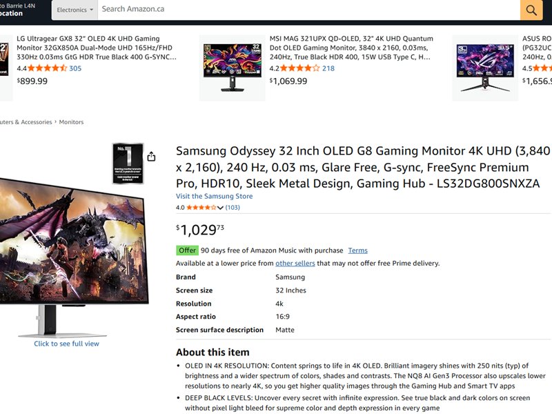 Samsung 32" Odyssey G8 OLED G-Sync Compatible Gaming Monitor - 4K UHD, 240Hz Refresh Rate, 0.03ms Response Time - Silver - (Model: LS32DG800SNXZA)