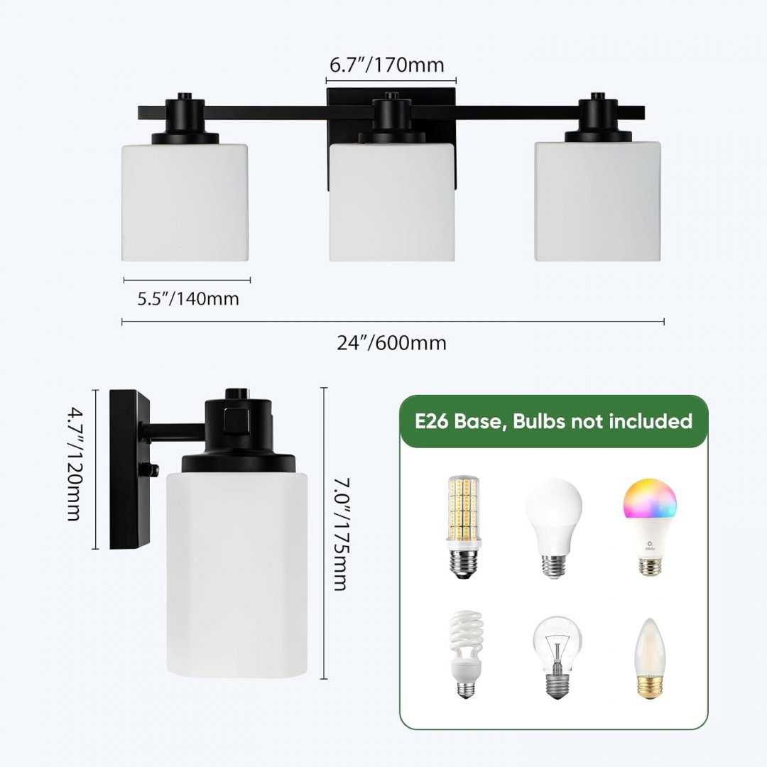 NEDYZOG 3-Light Bathroom Vanity Light Fixtures - 24" - BLACK