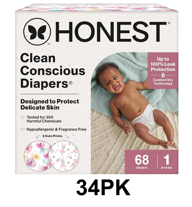 34pk the honest company clean conscious hypoallergenic disposable diapers - size 1 (8-14lbs) - "rose blossom/tutu cute"