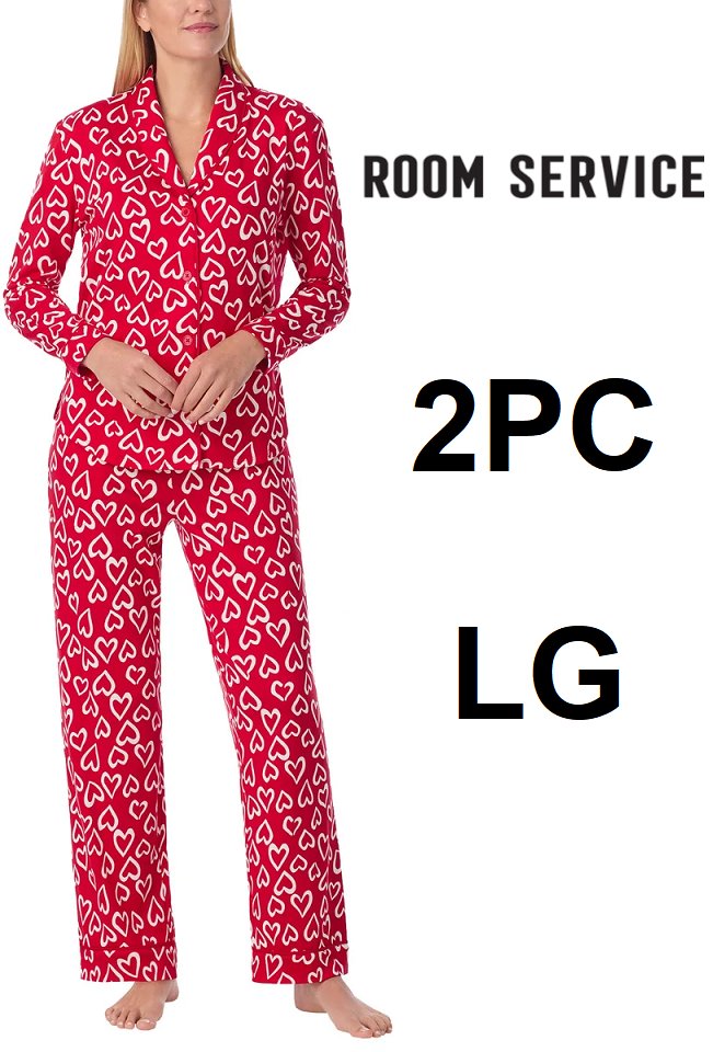 2pc women's room service soft touch button up pajama set - LARGE - red / PINK HEARTS (style: 1932322)