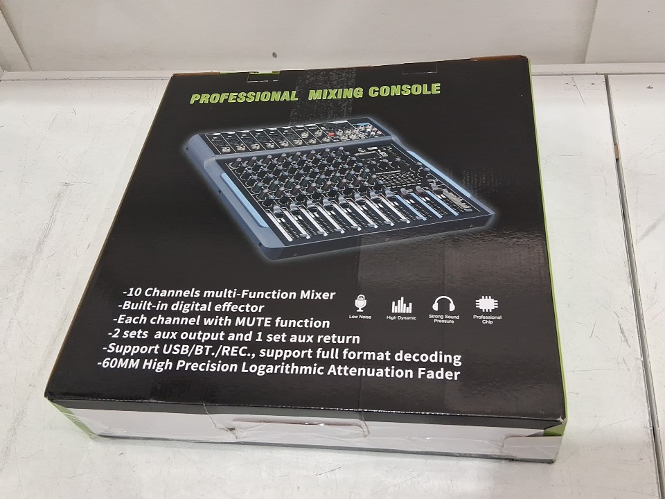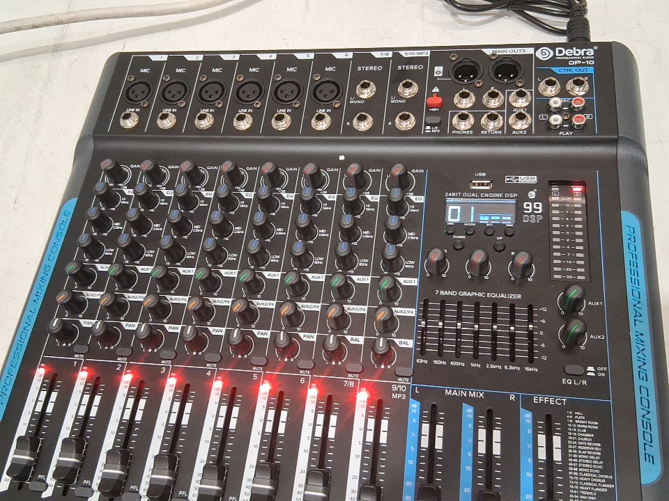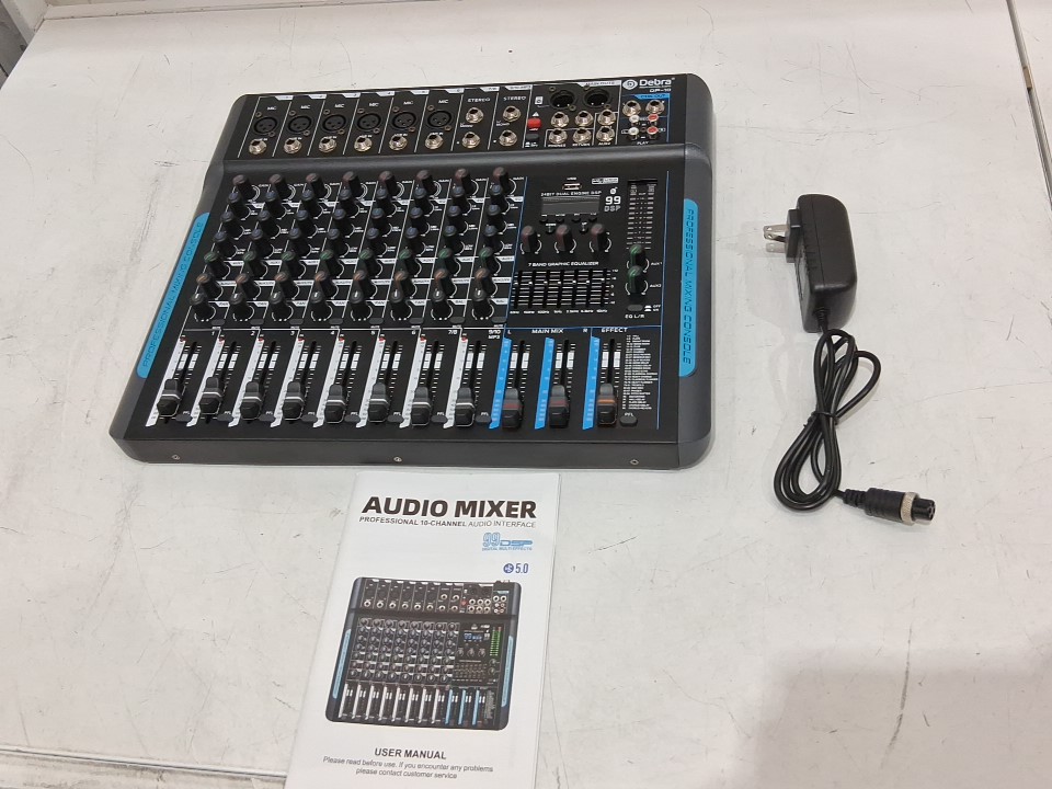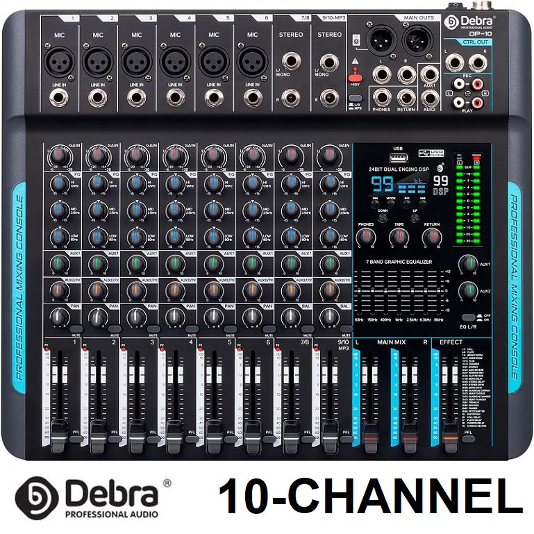 D Debra Professional Stereo Audio Mixer - 10 Channel, 99 DSP Reverb, 7-Band EQ, USB, 48V Phantom Power, One-Click Mute - black (model: dp-10)