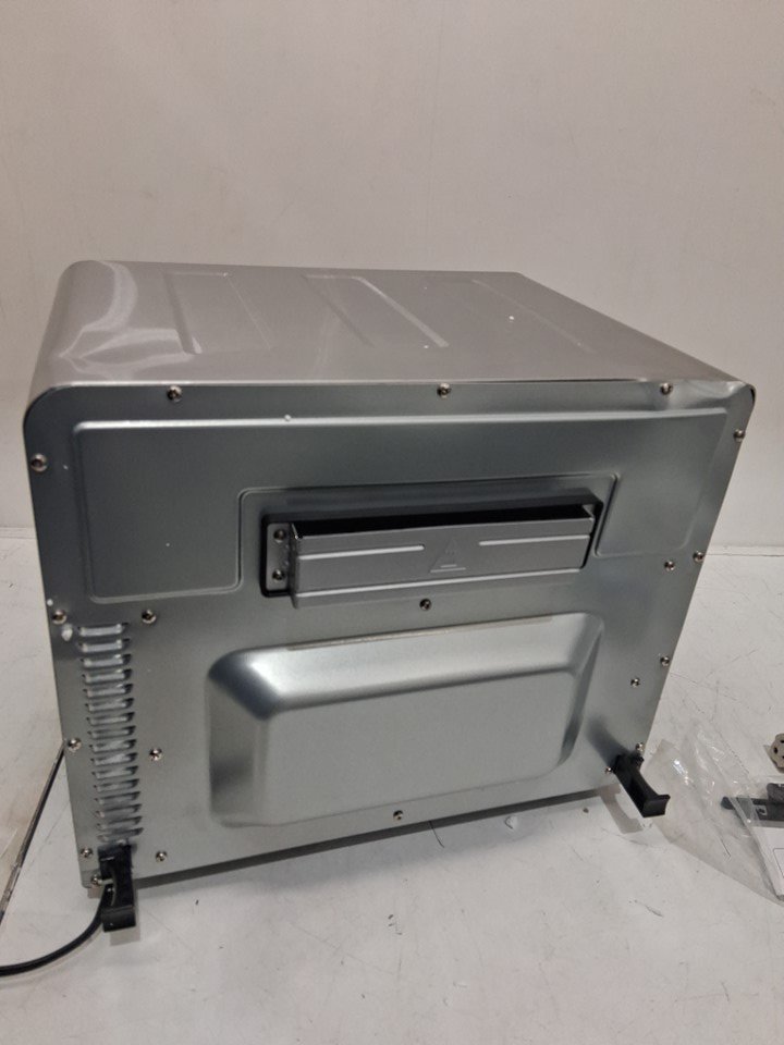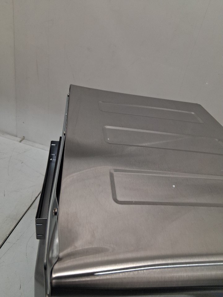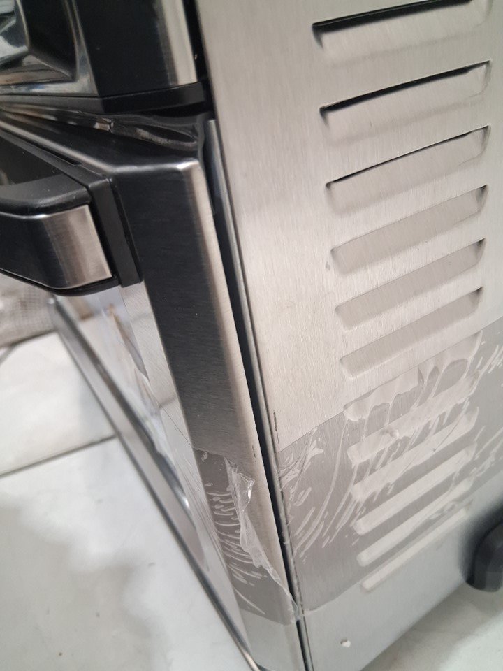 Item has dents towards the back on top and the back of the item. There is a slight gap when the door is closed. Tested for power.