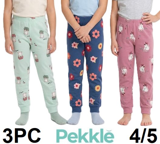 3PC GIRL's pekkle 100% organic cotton pajama pants - 4/5 - BLUE floral / pink cats / GREEN DOG (style: 3378844)