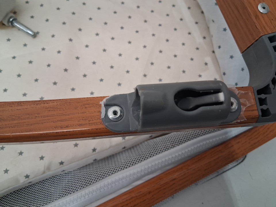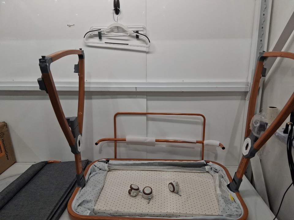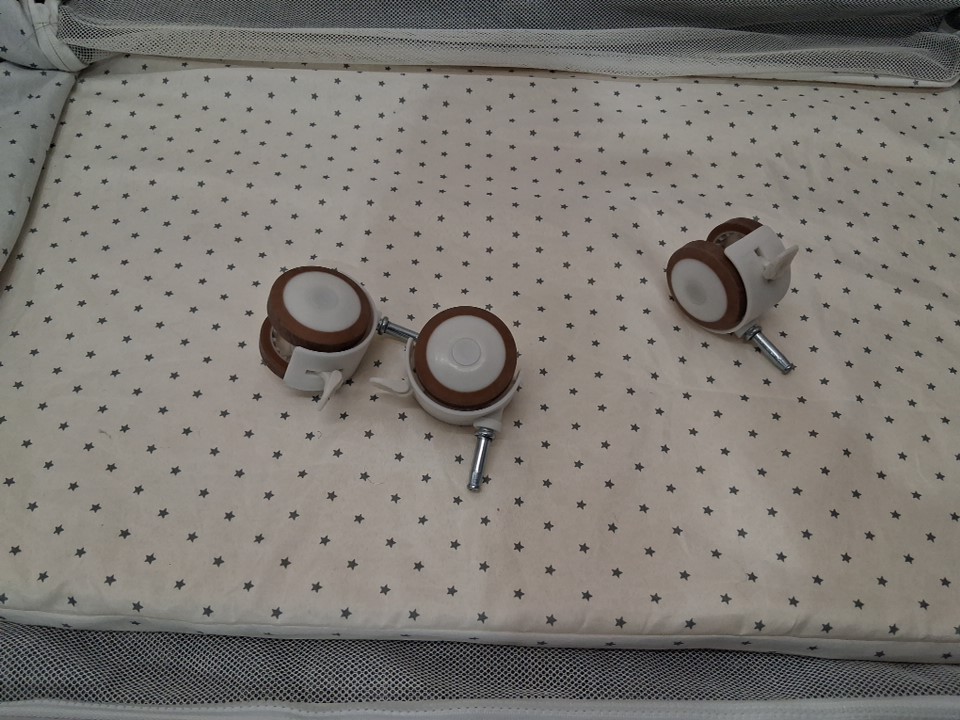 wheels have visible dirt discoloration and one wheel is missing, one prong to hold bottom shelf is bent inwards