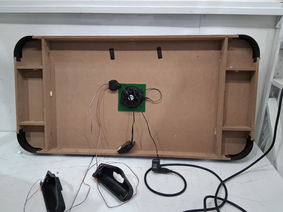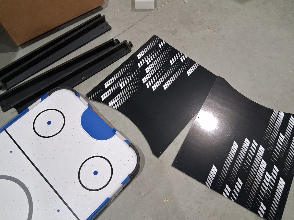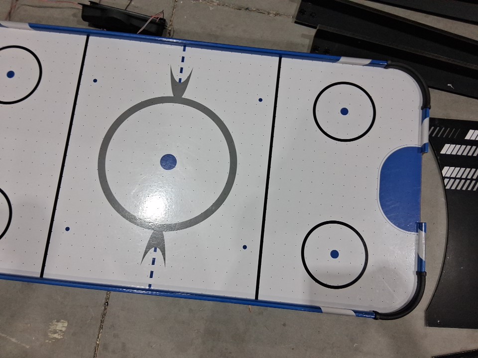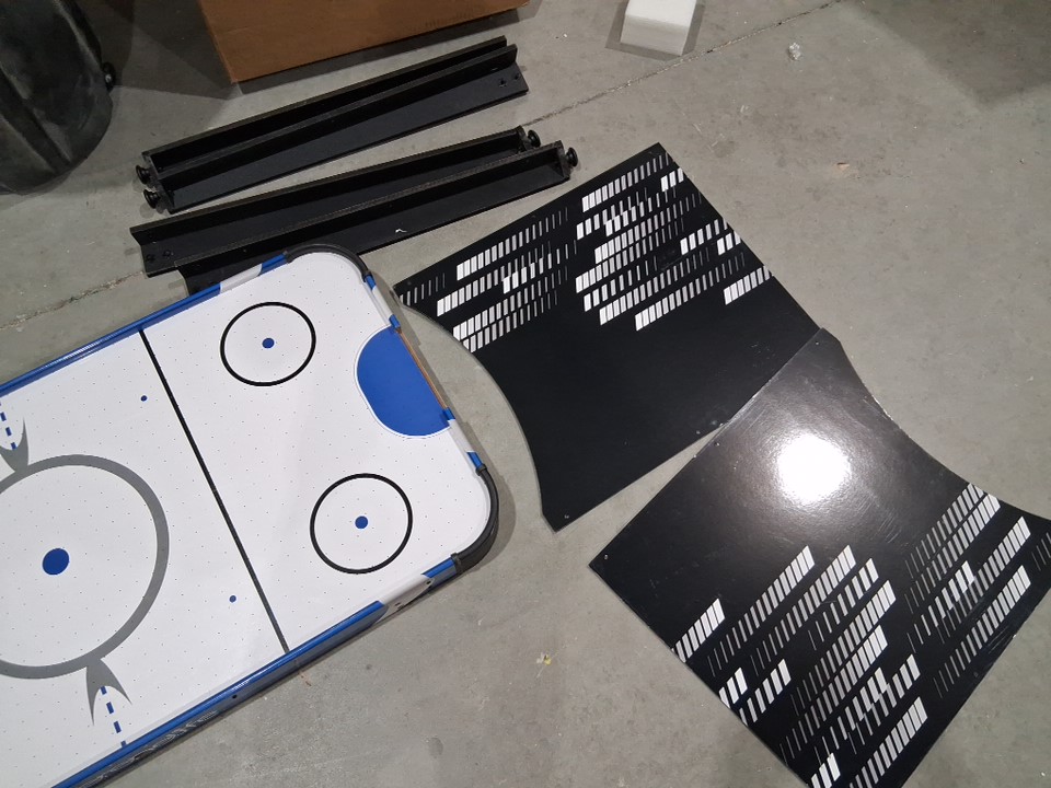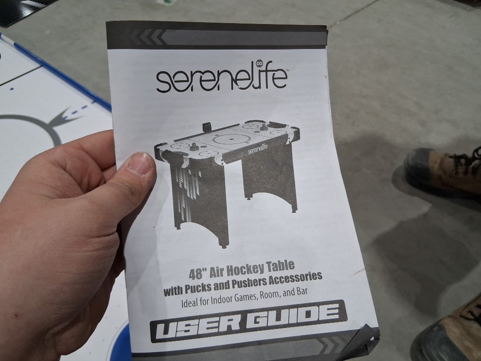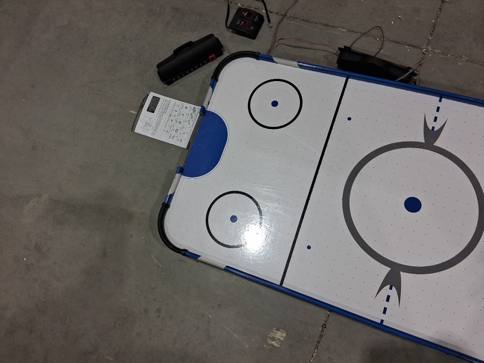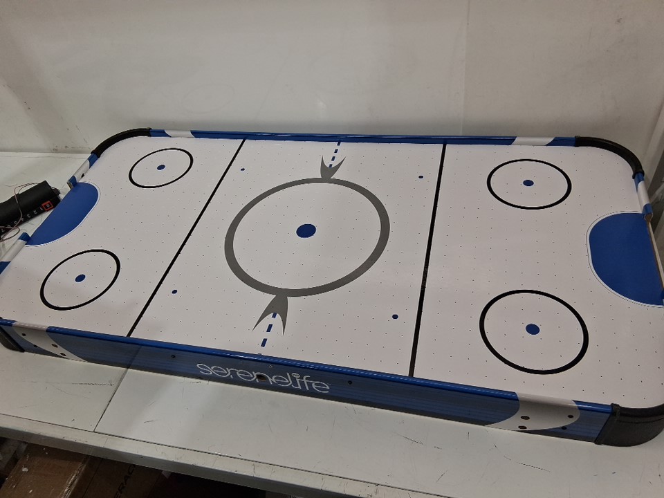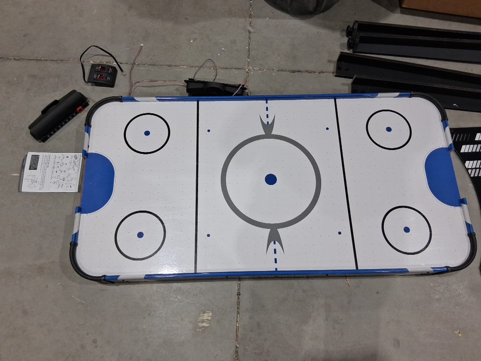 The product came to us in an unusable state. Customer can use this as a makeshift pretend play air hockey table. There is heavy scuffing across the legs as well as across the board in general. The pieces to connect the legs are missing. Our staff have thoroughly tested the motor and have determined it does not turn on or work. To make this item usable for its original purpose (running air through it to create a full air hockey experience) the customer would have to do heavy maintenance to the piece to make it usable.