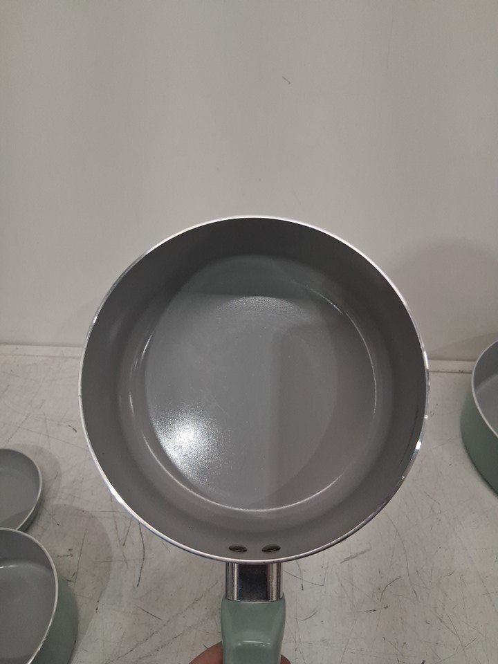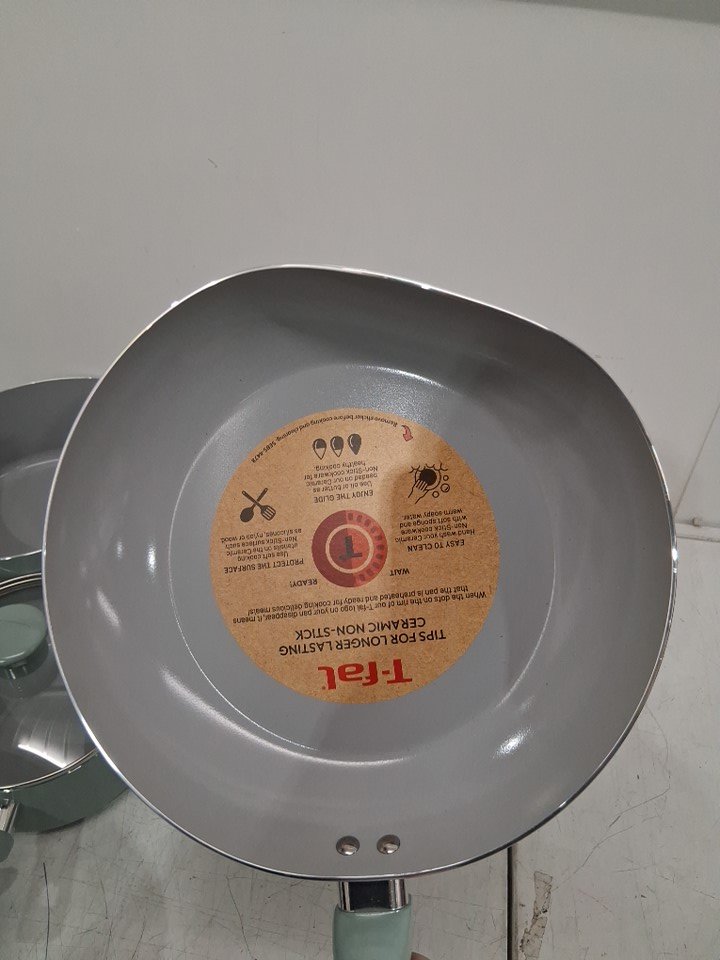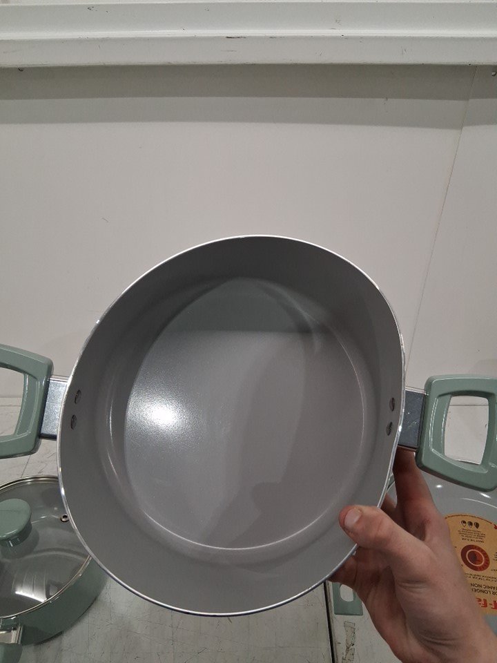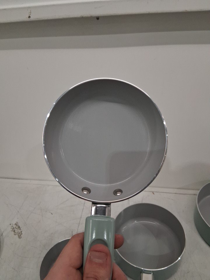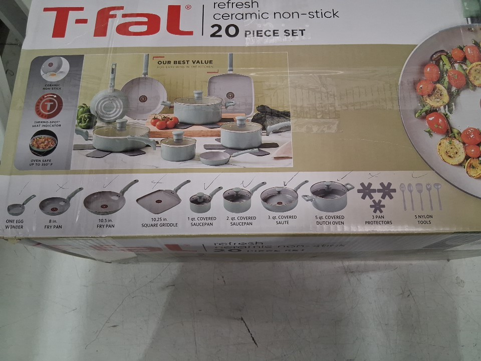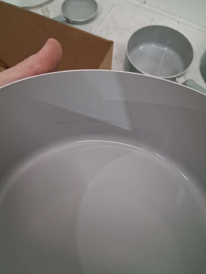 *The set is missing the square griddle, 8-inch frying pan, the pan protectors and 1 of the nylon tools*. The 10.5" frying pan, the 3qt sauté pan, and the 5qt dutch oven are all slightly bent due to shipping, the lids do not fit on them. A couple pans/pots have scuff marks on the underside of the handles, and 2 pots/pans have to scuff marks on the inside from shipping. (Please see photos)