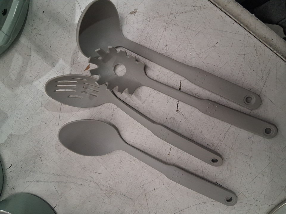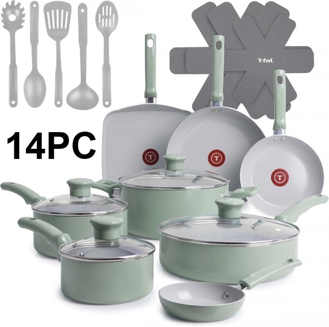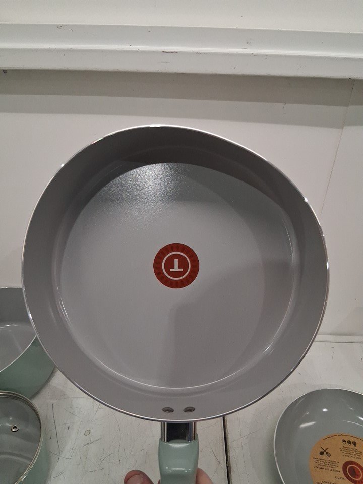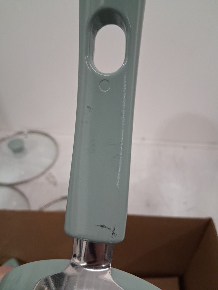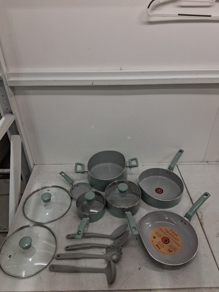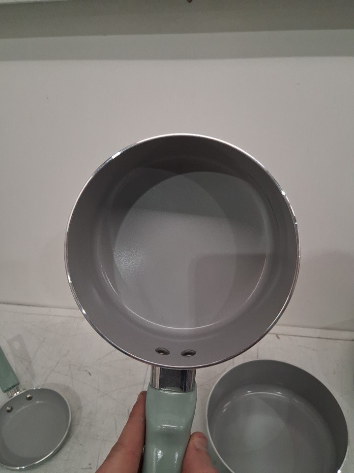 *The set is missing the square griddle, 8-inch frying pan, the pan protectors and 1 of the nylon tools*. The 10.5" frying pan, the 3qt sauté pan, and the 5qt dutch oven are all slightly bent due to shipping, the lids do not fit on them. A couple pans/pots have scuff marks on the underside of the handles, and 2 pots/pans have to scuff marks on the inside from shipping. (Please see photos)