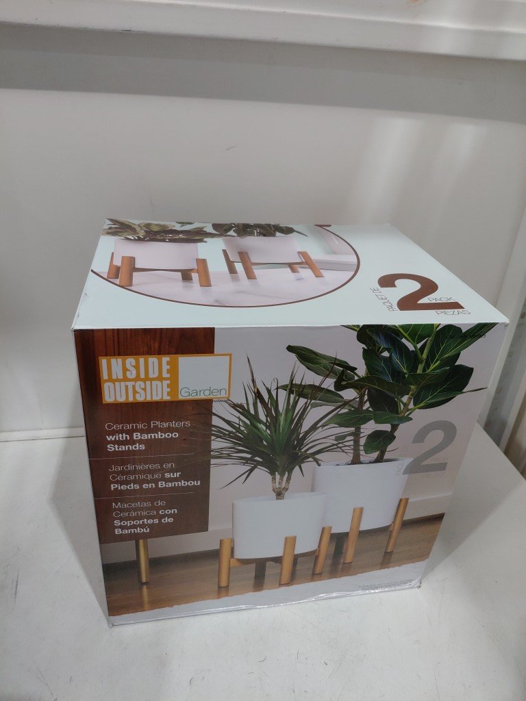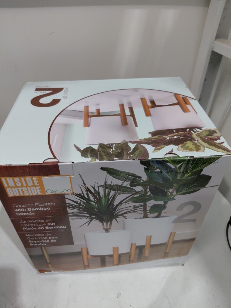 2pk inside outside garden ceramic planters with bamboo stands - 9.2" and 7.7" - white/beige (model: 1807223)