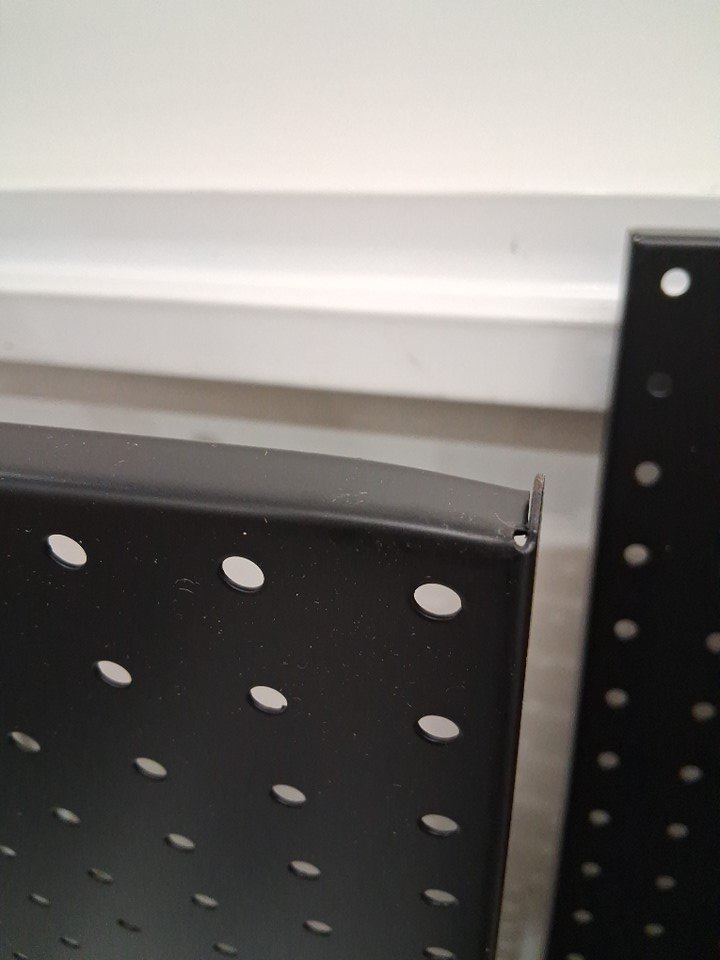 One panel has small dent in corner. Sticker labels paper has slight tears likely caused during repackaging. (See photos)