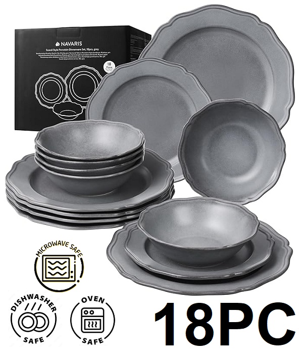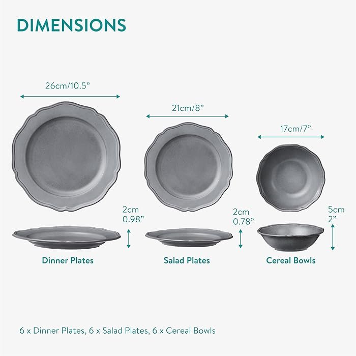 Includes: 6 dinner plates, 6 salad plates, and 6 cereal bowls.