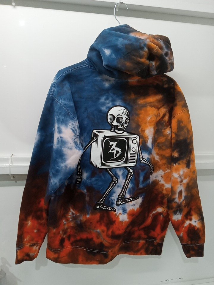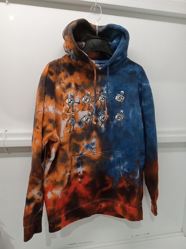 unisex *limited edition* zeds dead deadbeats festival dancing skeleton pullover hoodie - small - tie dye orange/blue