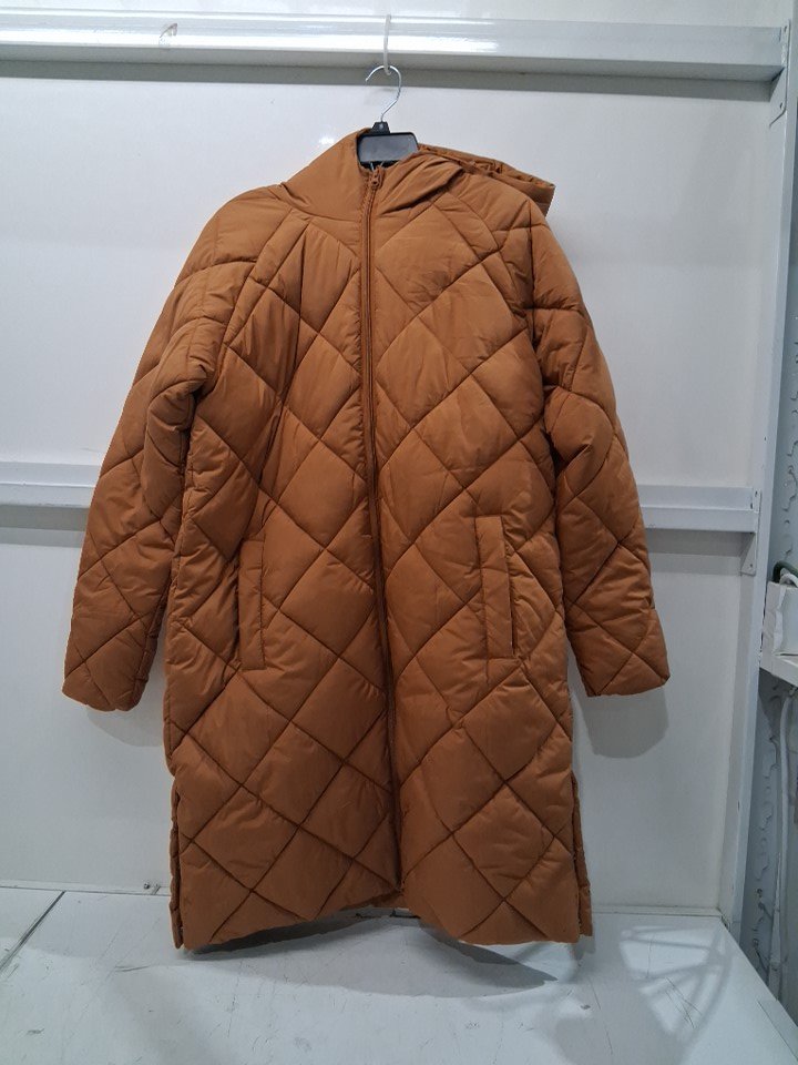 womens amazon essentials Heavyweight Diamond Quilted Knee Length Puffer Coat - medium - tan