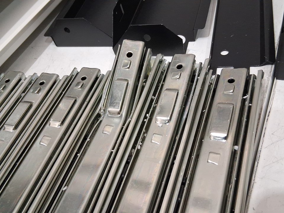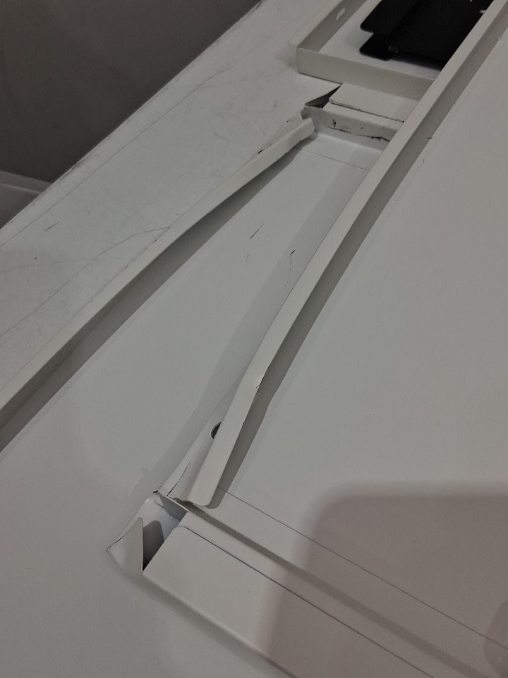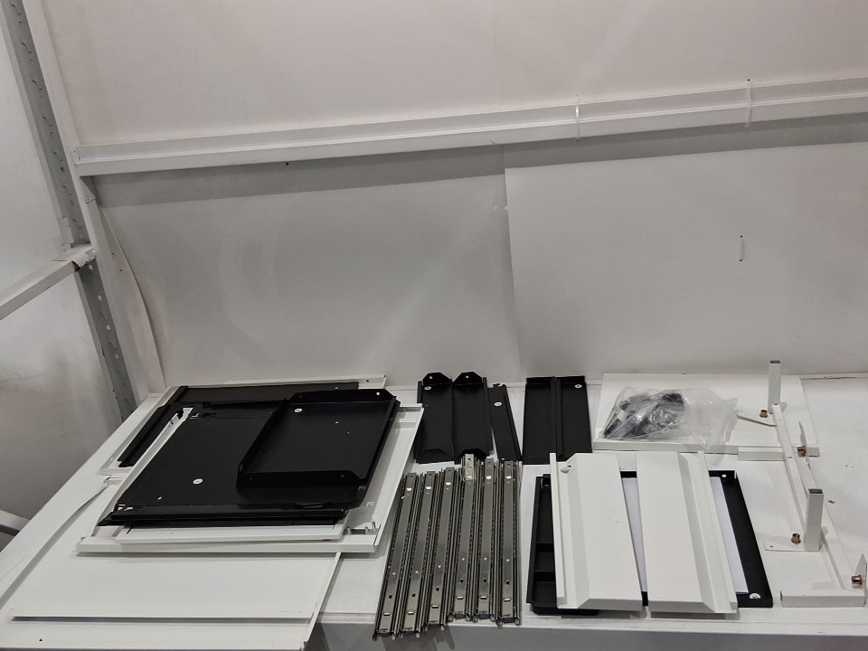 Item has a few scratches/markings on various pieces from previous use, see photos. Item has a few warps/bends in the metal pieces which can likely be bent back into shape, 2 of the drawer slides are bent/warped and will likely need to be replaced, see photos.