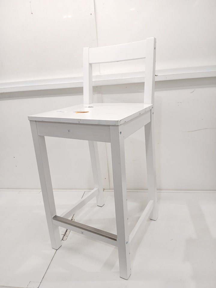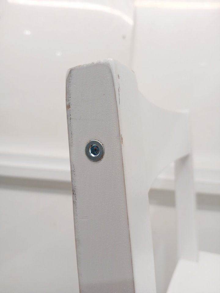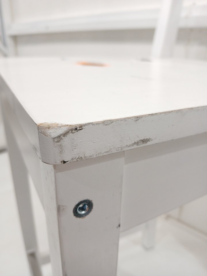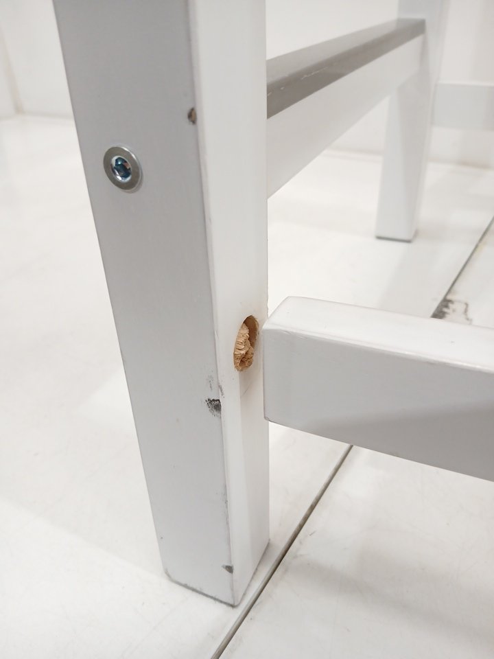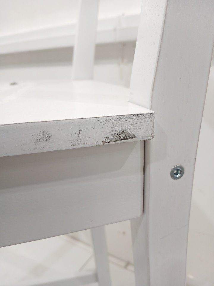 The piece of wood that connects the legs is damaged. This item has a lot of scratches and scuffs from previous use