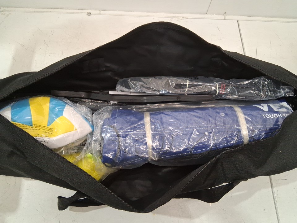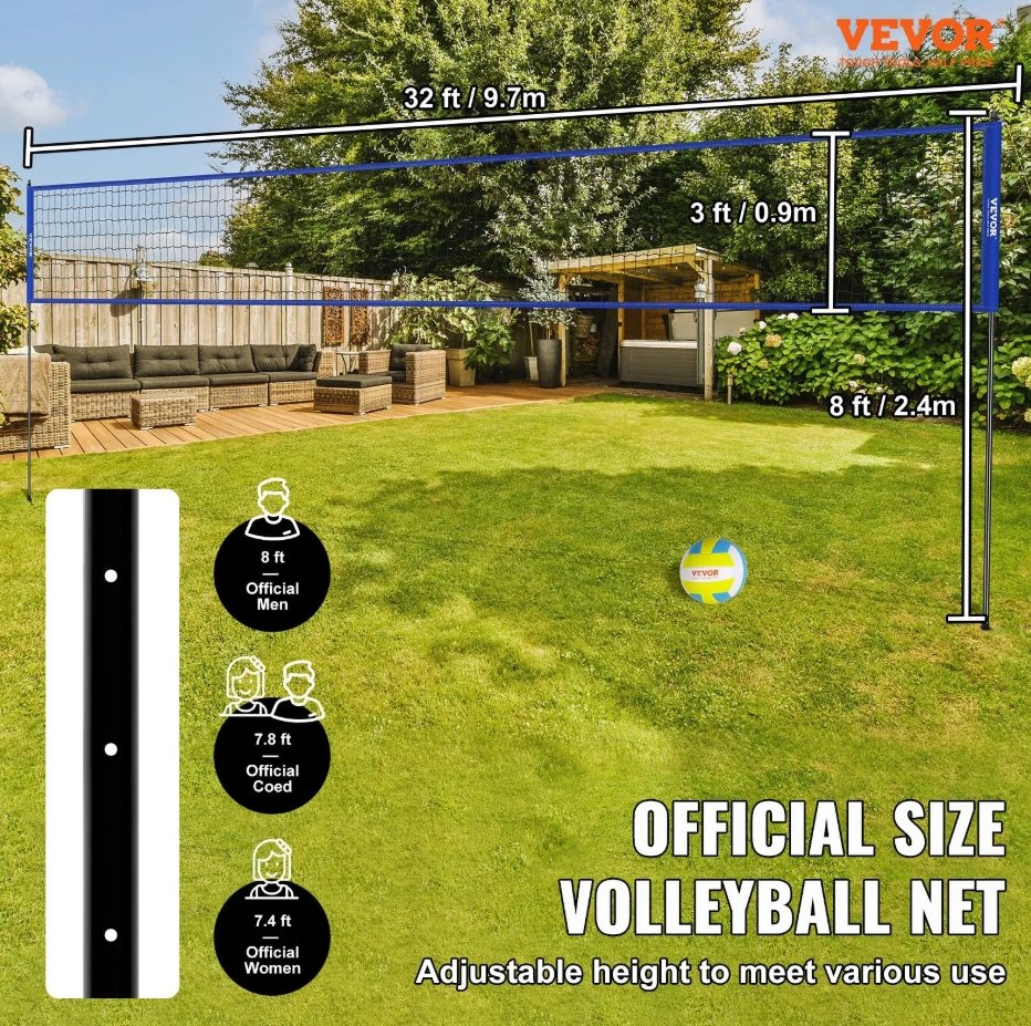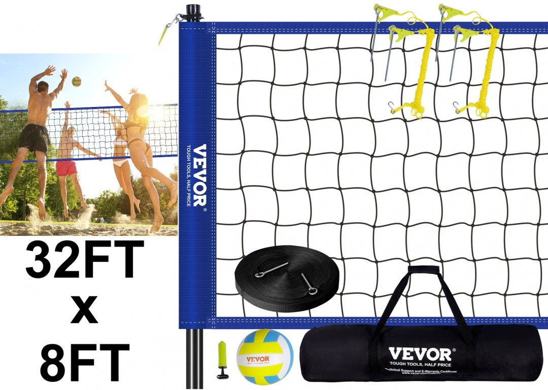 Outdoor Portable Volleyball Net System, Adjustable Height with PVc Volleyball, Pump, Carrying Bag - 32ft x 8ft - blue/black (model: JH-202)