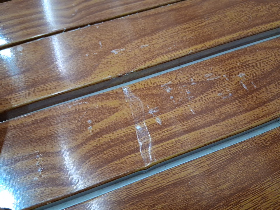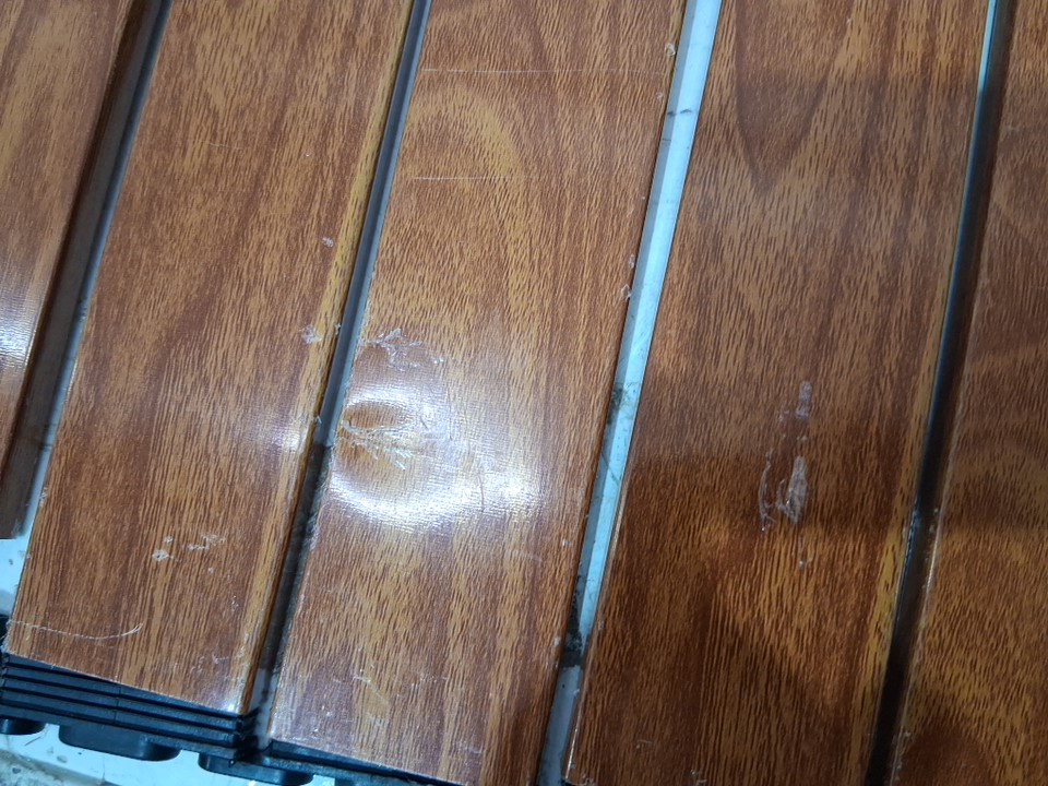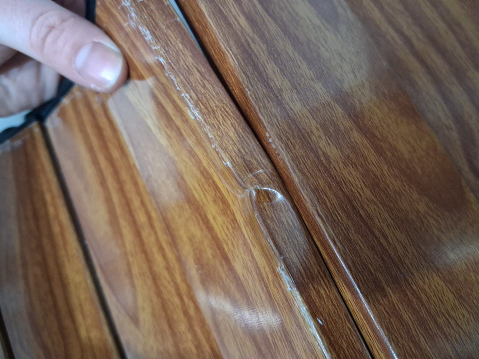 items top has some dents in some planks, some planks need to be re attached and film on planks is distressed in some spots ( see photos)