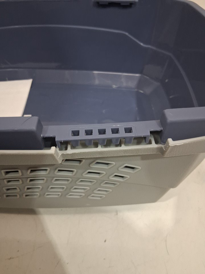 one of the latches is broken but the other 3 are still perfectly functional and there are scuffs and hair in the bottom blue piece showing use(see photo)