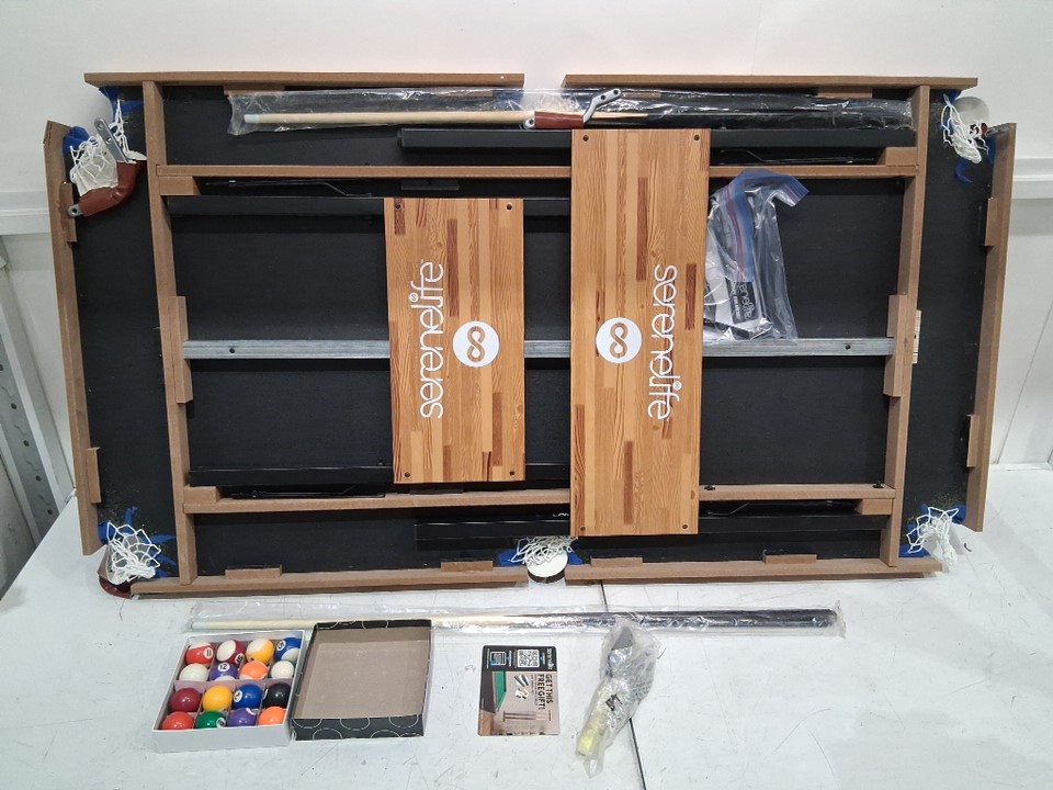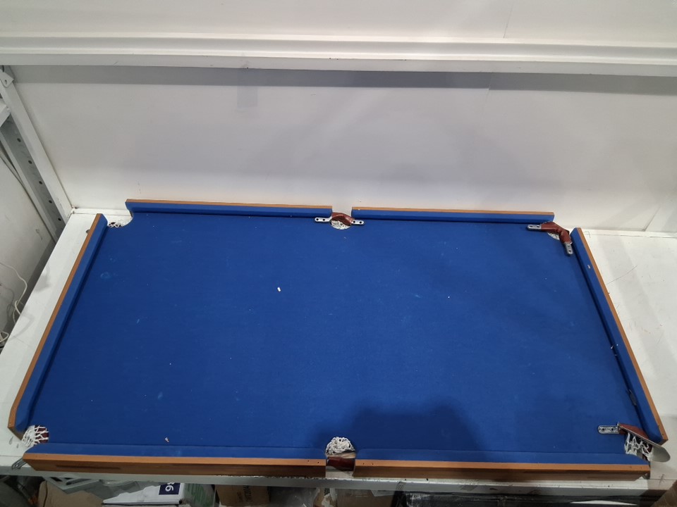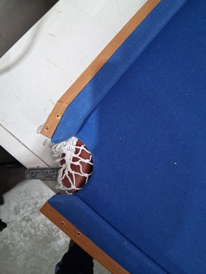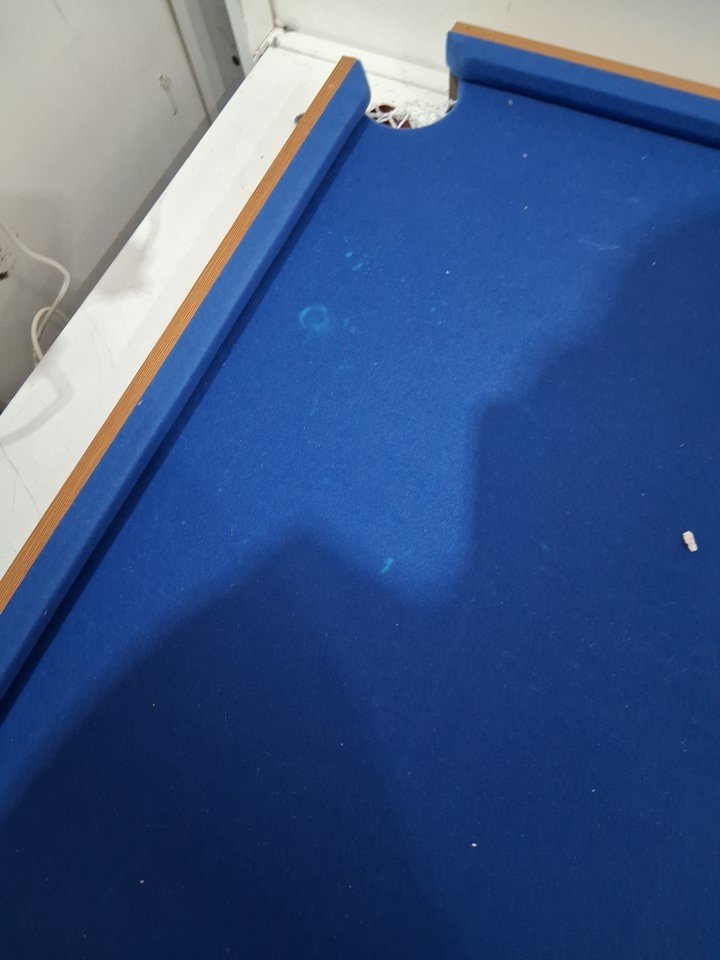 Part of the wooden framing by the corner pocket is damages, see photos. Scuff marks on the pool tale felt, see photos