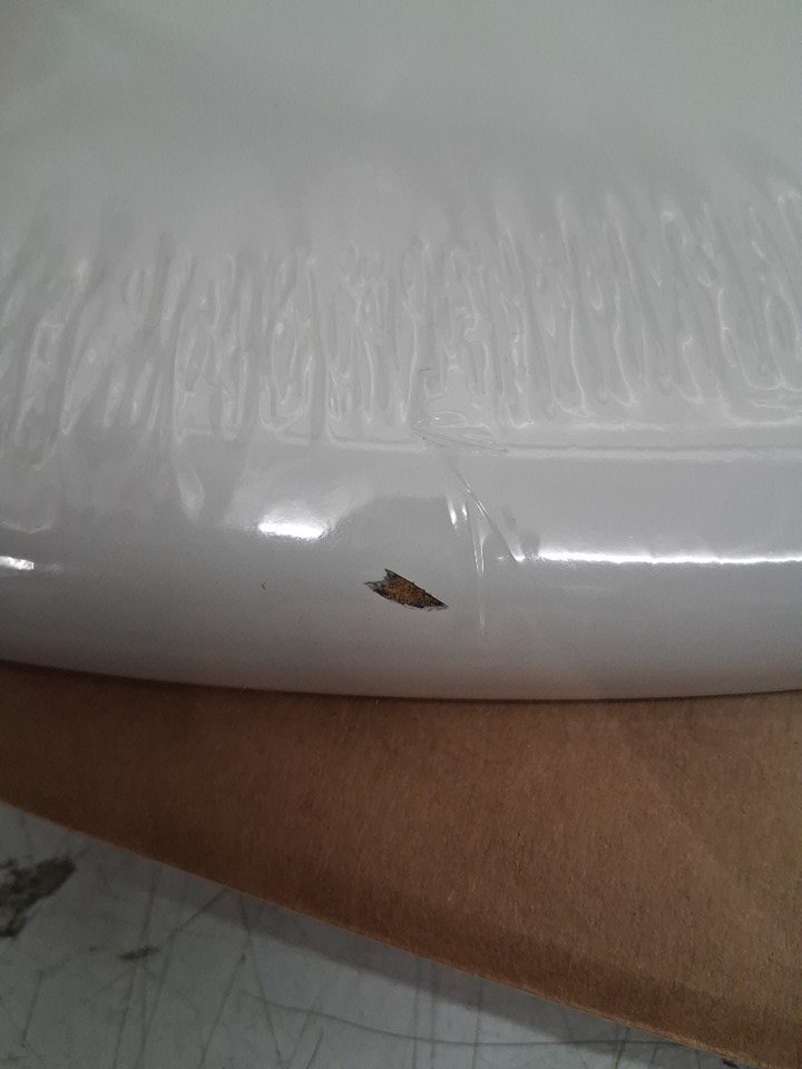 There is one small paint chip on the top of the toilet seat due to shipping and handling, the toilet seat is new in its original packaging.