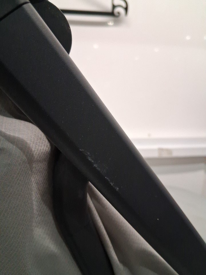 item has stains on the seat and scratches on the body parts. dirt on the tire indicating light previous use and odor is coming from the seat, need to be washed before using it (see photos).