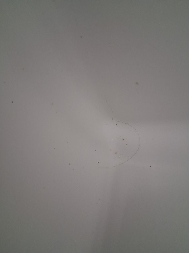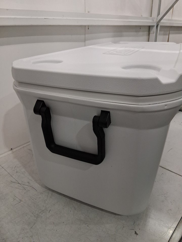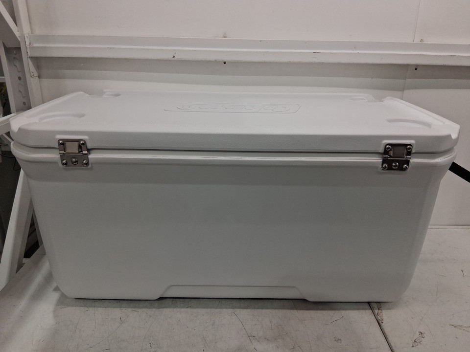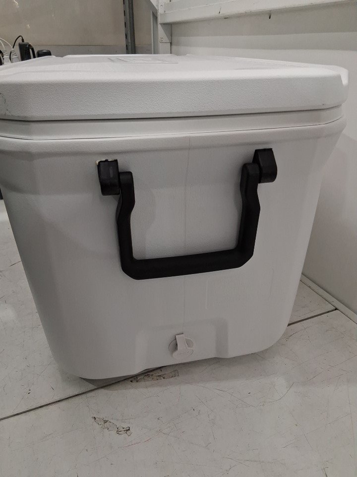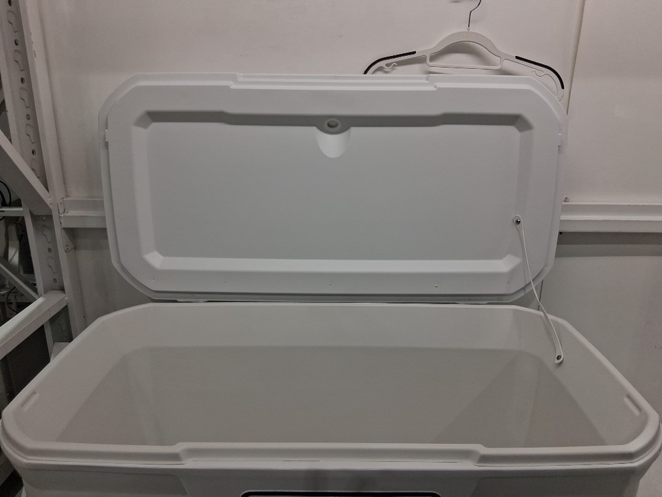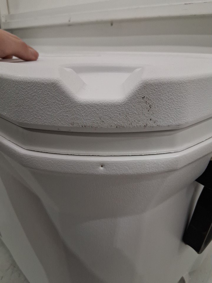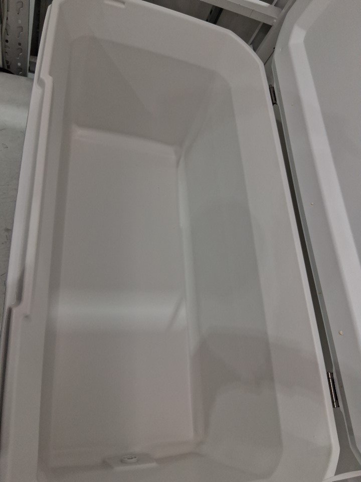 There are some crumbs and a couple pieces of hair in the cooler, there is also one scuff mark on the front right corner of the cooler due to previous use.