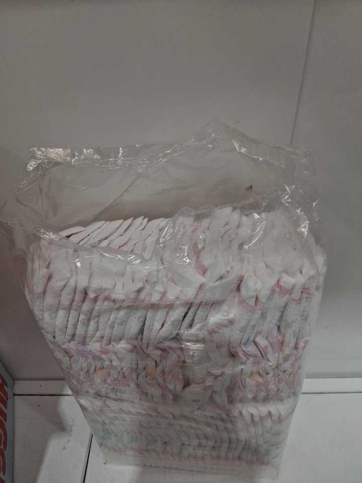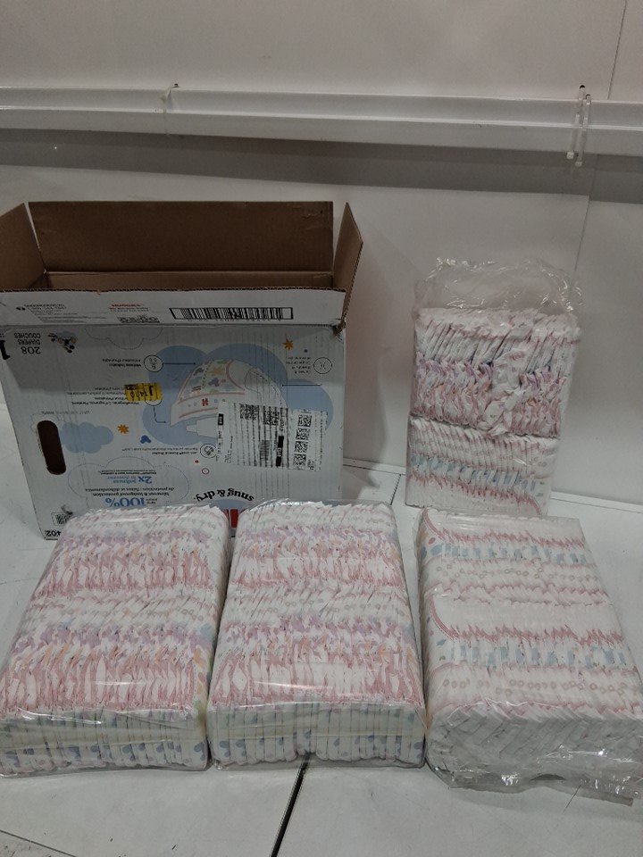 Item has one sleeve of diapers opened and missing roughly 7 diapers. all three other sleeves are still sealed. See image details.