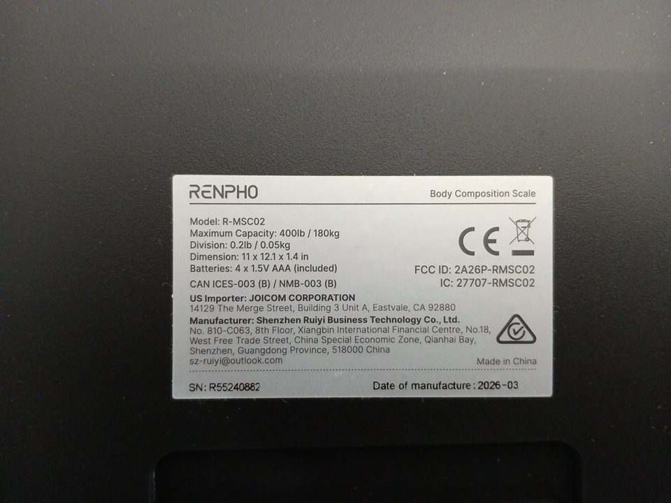 renpho smart Scale for BMI Body Fat Muscle Mass - 400lbs max - black (model:‎R-MSC02)