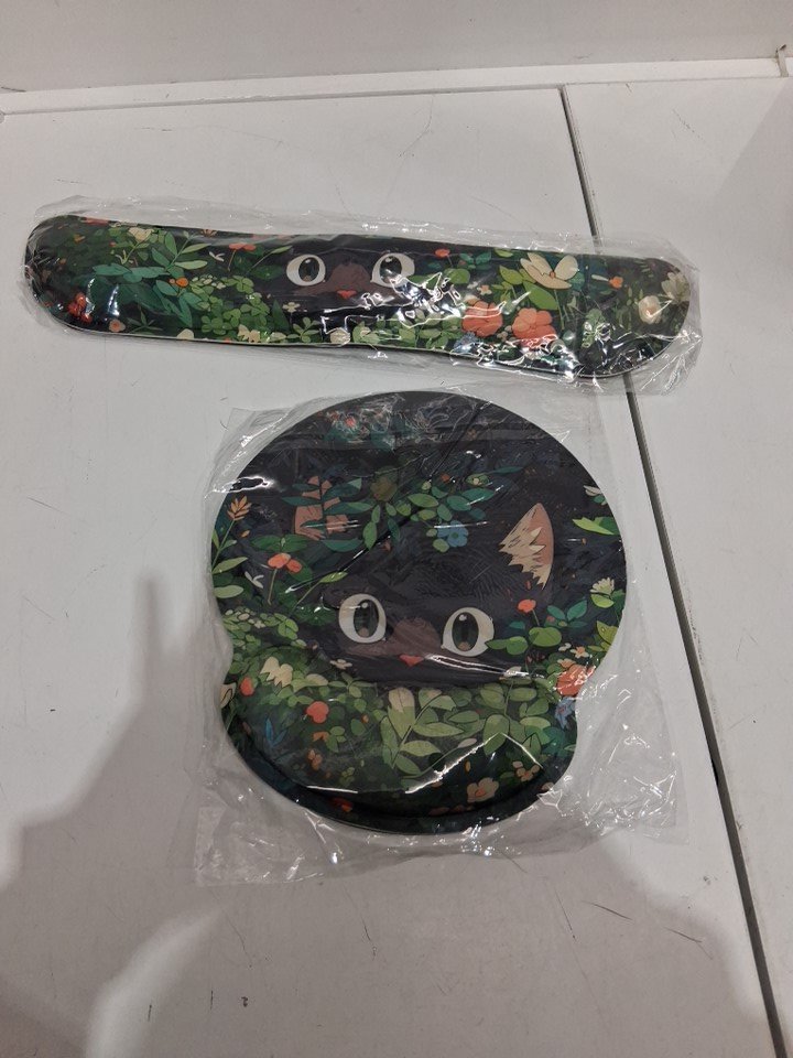 Ergonomic padded keyboard wrist rest and Mouse Pad with anti-slip backing - curious cat/green/black
