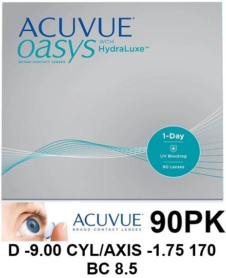 90PK Acuvue Oasys HydraLuxe Daily Contact Lenses with UV Blocking - D -9.00 CYL/AXIS -1.75 170 BC 8.5 - ASTIGMATISM