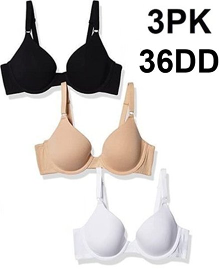 3pk women's fruit of the loom underwire light lined t-shirt bras - 36dd - black/white/beige (style: ft797pk)