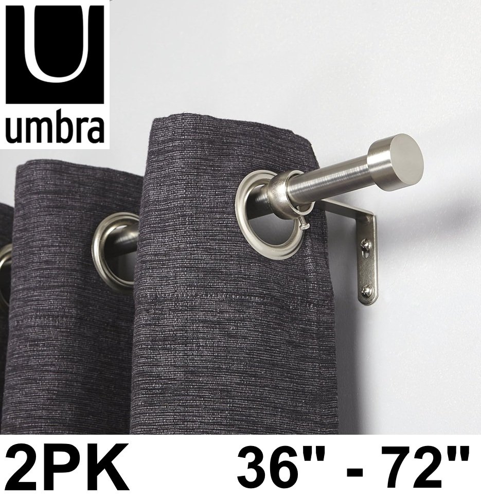 2PK UMBRA CAPPA ADJUSTABLE 3/4" CURTAIN RODs WITH BRACKETS & HARDWARE - 36"-72" - NICKEL