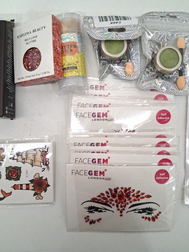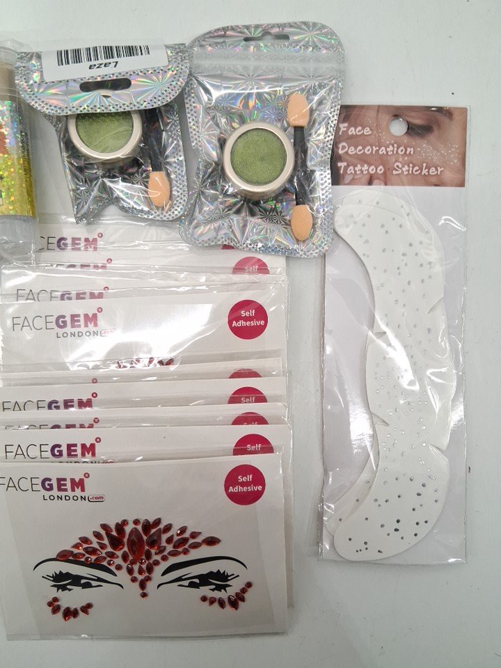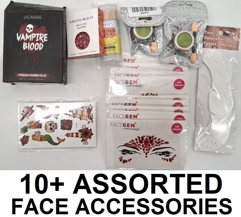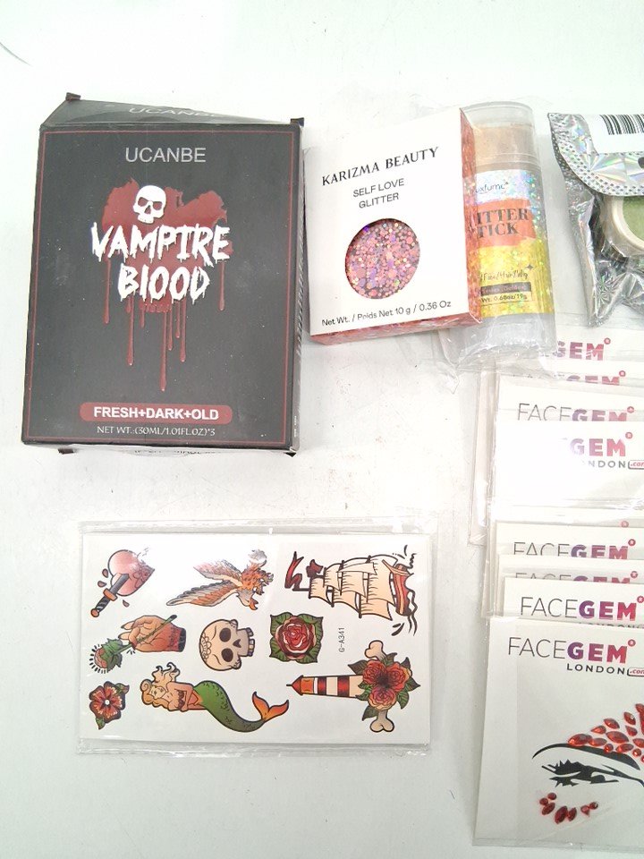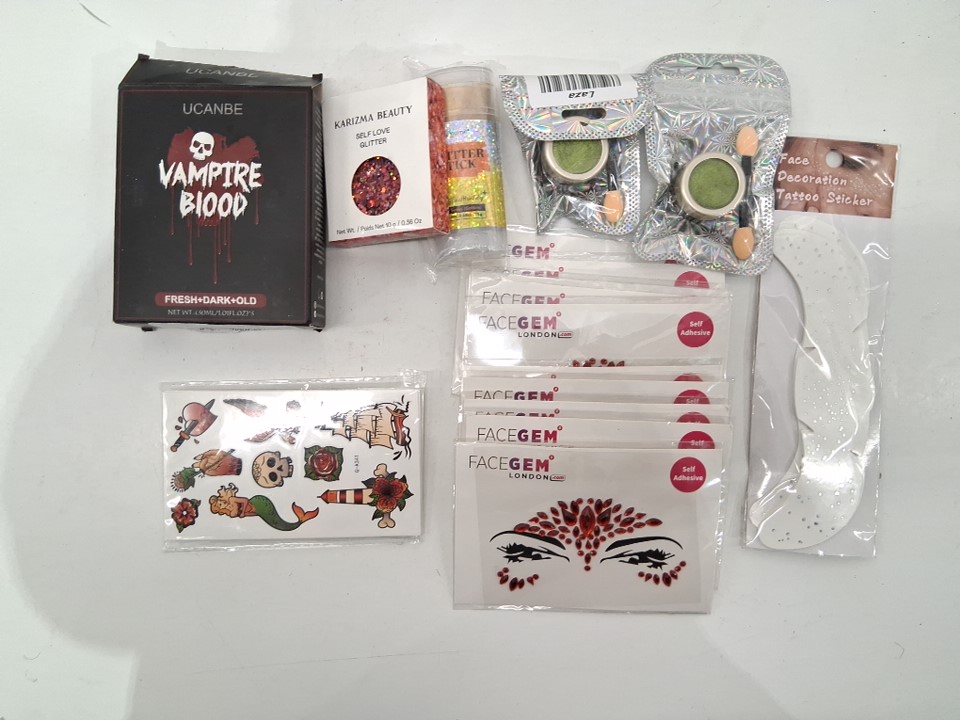 10+ assorted face accessories - assorted brands, types and uses - face gems / fake tattoos / fake blood / glitter