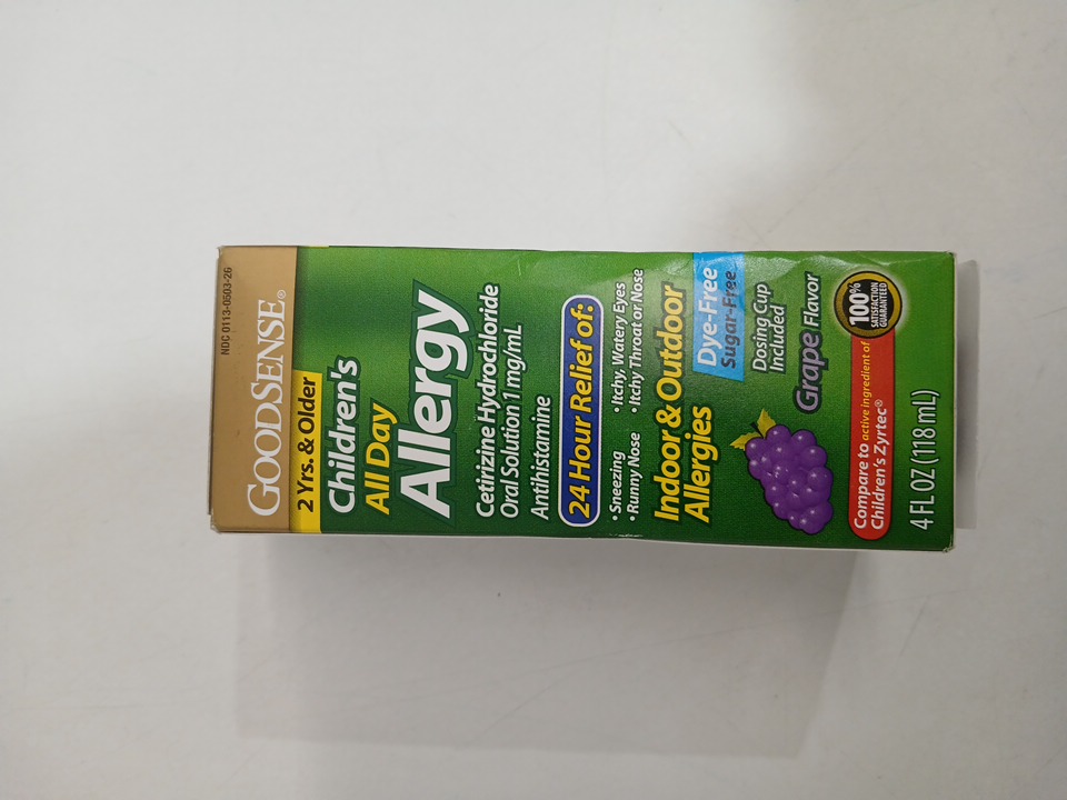 ** expires soon ** goodsense children's all day allergy 24hr relief cetirizine hydrochloride oral solution - 2yrs and older - grape flavour - 118ml