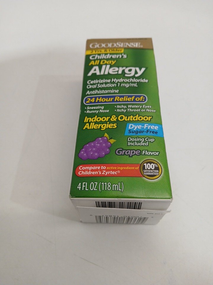 ** expires soon ** goodsense children's all day allergy 24hr relief cetirizine hydrochloride oral solution - 2yrs and older - grape flavour - 118ml