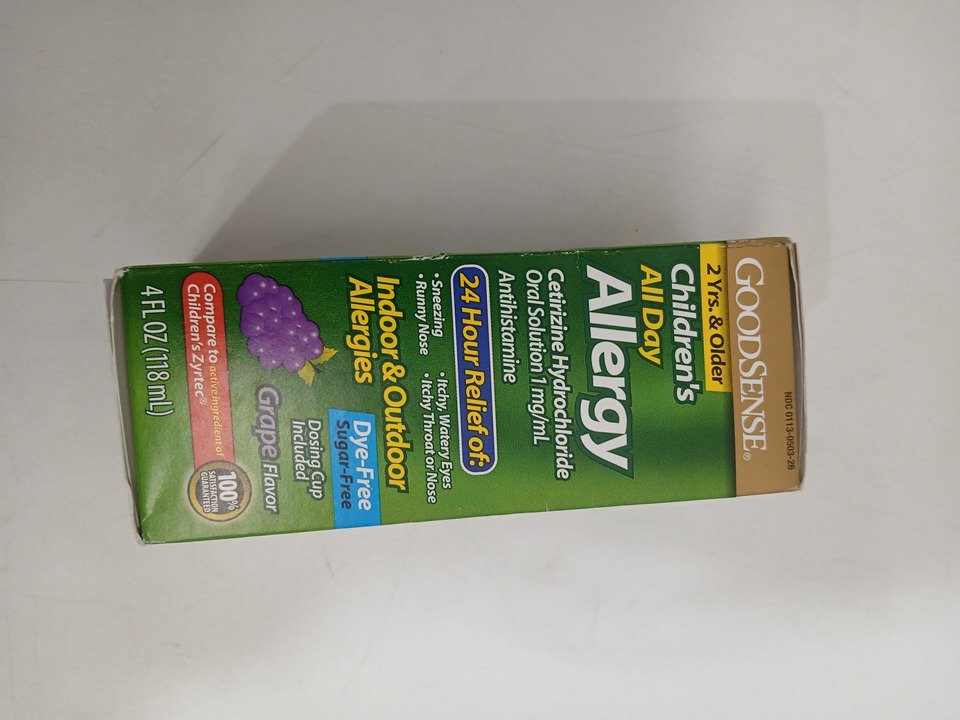 ** expires soon ** goodsense children's all day allergy 24hr relief cetirizine hydrochloride oral solution - 2yrs and older - grape flavour - 118ml