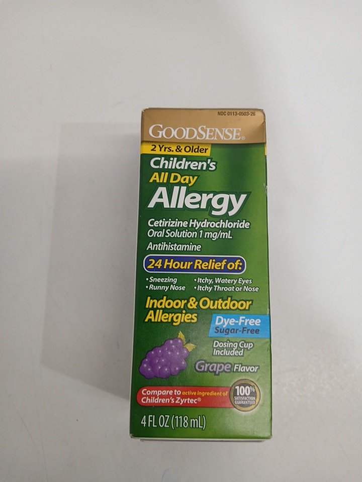 ** expires soon ** goodsense children's all day allergy 24hr relief cetirizine hydrochloride oral solution - 2yrs and older - grape flavour - 118ml