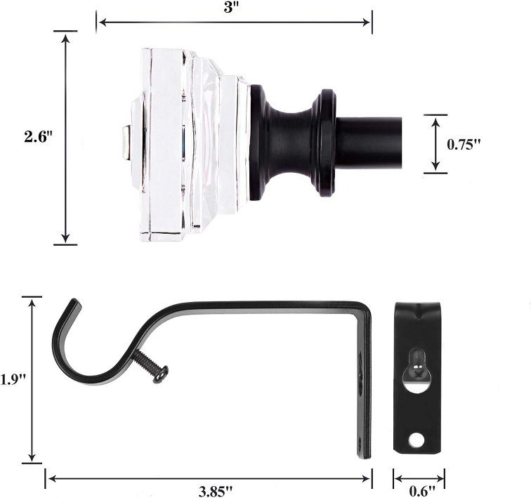 2 Coquilles ADJUSTABLE Acrylic Square Finials Curtain Rod - 3/4" Diameter - 86" - 120" - Black (MODEL:19Y002-B-L)
