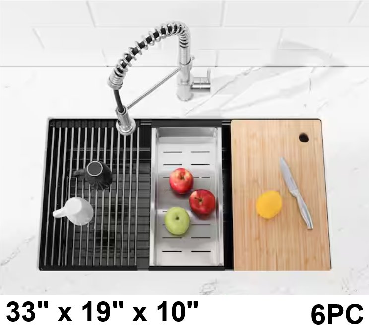 6 PC Undermount Single Bowl 20-Gauge Stainless Steel Modern Workstation Kitchen Sink with Accessories -