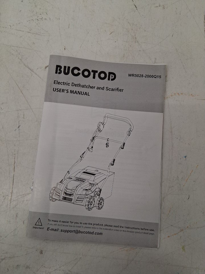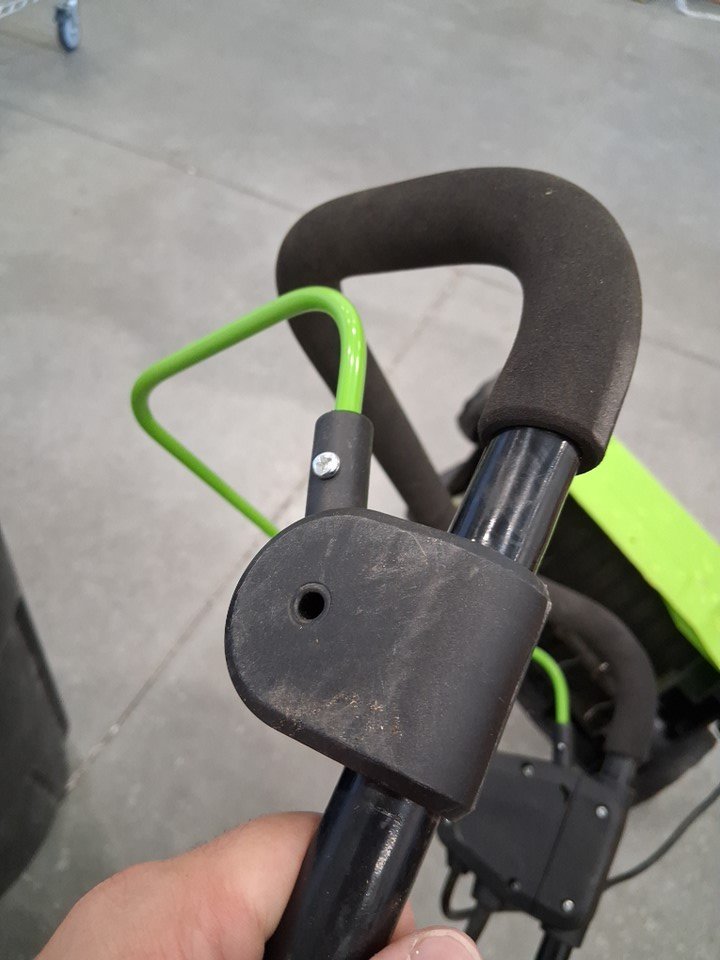 Presence of some grass on the exterior and underside of the machine, plus some dust and a small tear in the foam on the handle indicate some previous use, but all parts appear present and in good condition - see photos. Tested for power.