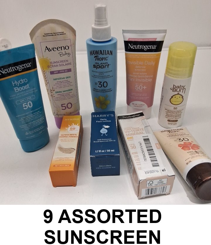 9 ASSORTED SUNSCREEN - ASSORTED SIZES AND TYPES